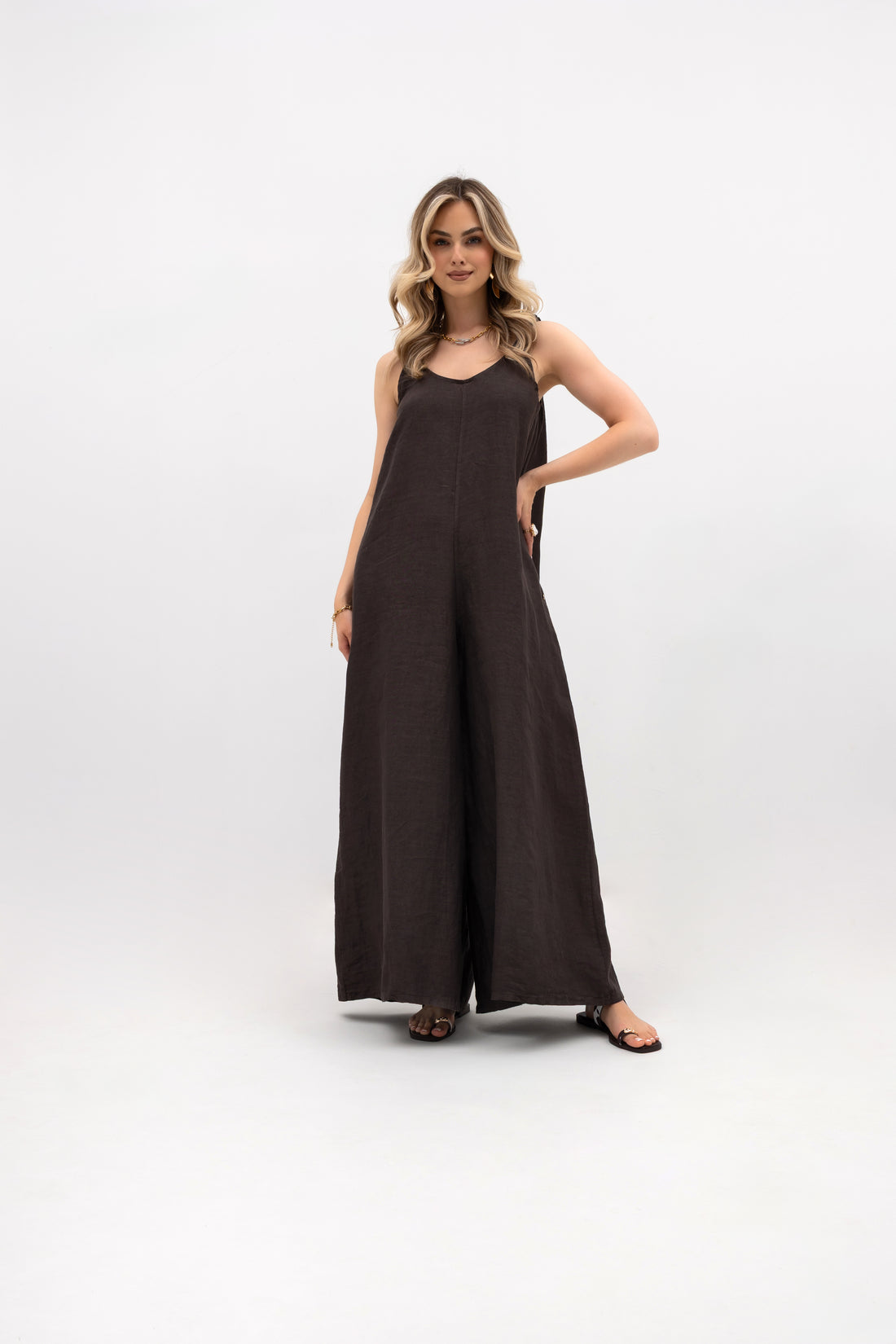 Lniany kombinezon na ramiączkach – szerokie nogawki i ozdobne marszczenieLniany kombinezon na ramiączkach – szerokie nogawki i ozdobne marszczenie
