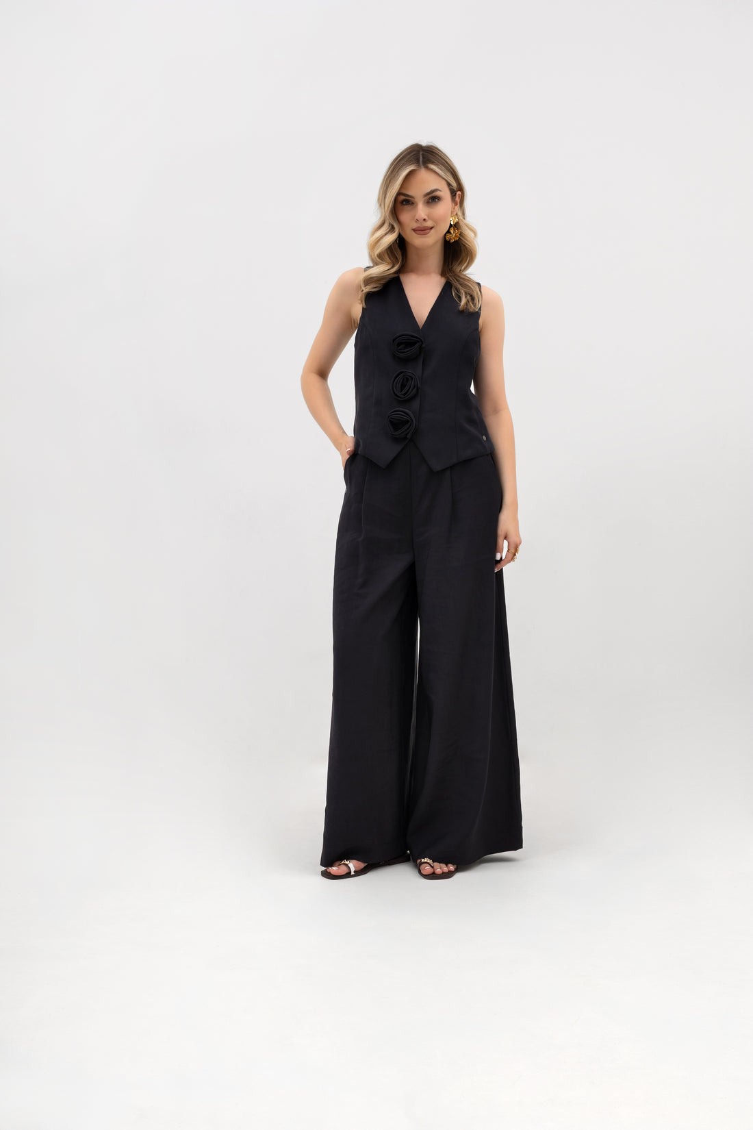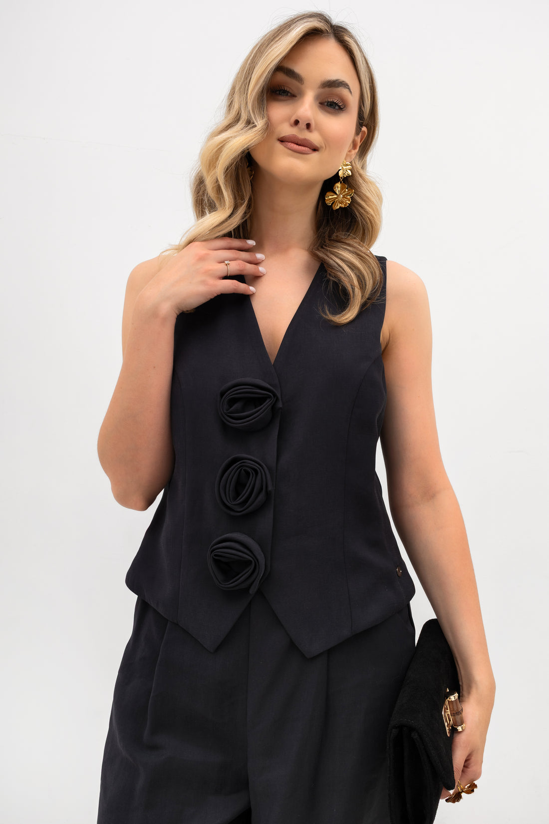Kamizelka damska z kwiatowymi guzikami – elegancki fason z regulacjąKamizelka damska z kwiatowymi guzikami – elegancki fason z regulacją