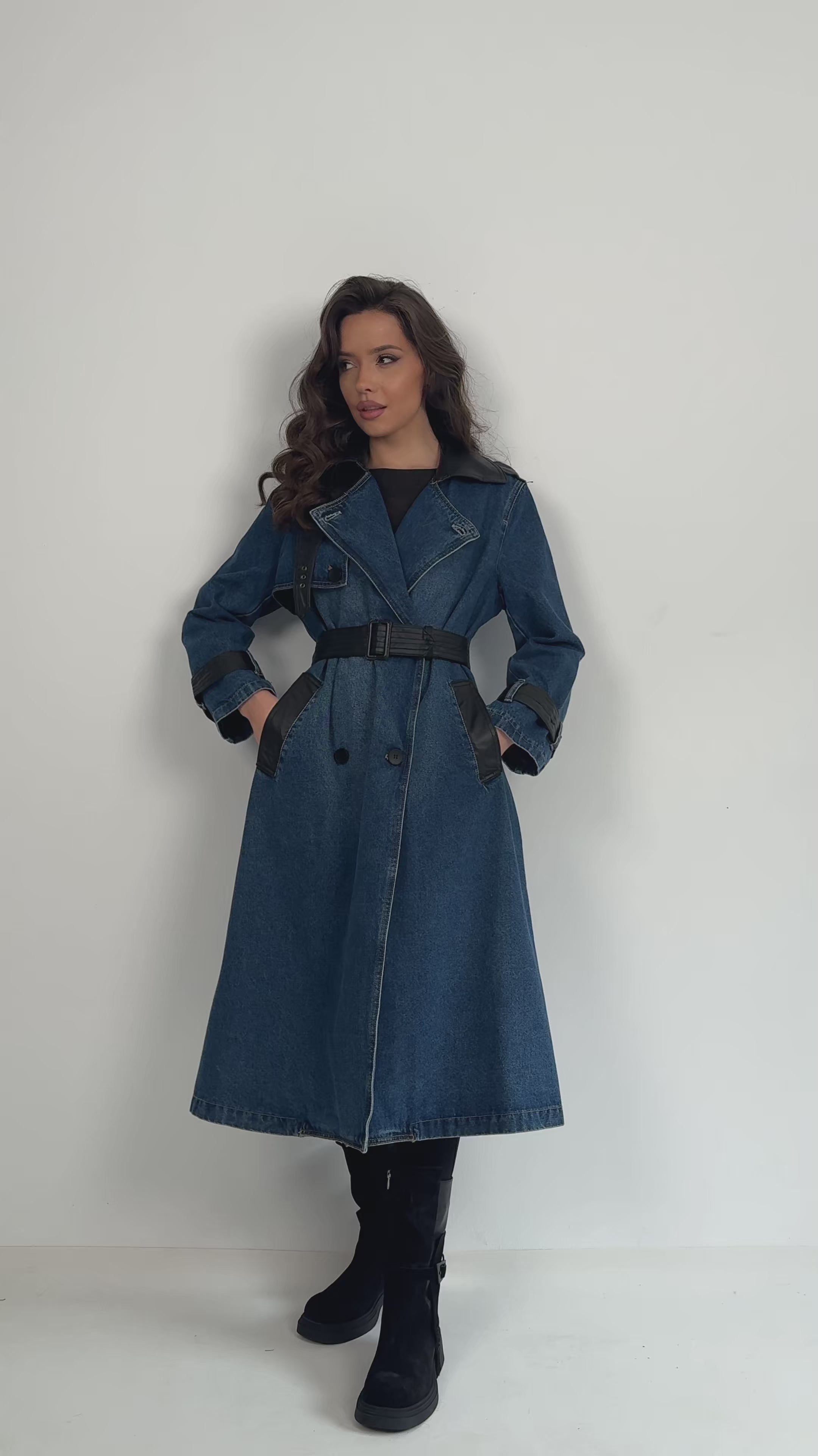 Ten wyjątkowy płaszcz jeansowy to nowoczesna interpretacja klasycznego trencza — łączy w sobie ponadczasowy fason i charakterystyczny, surowy urok denimu z eleganckim wykończeniem z ekoskóry. To model, który łączy styl z funkcjonalnością i przyciąga uwagę dopracowanymi detalami.