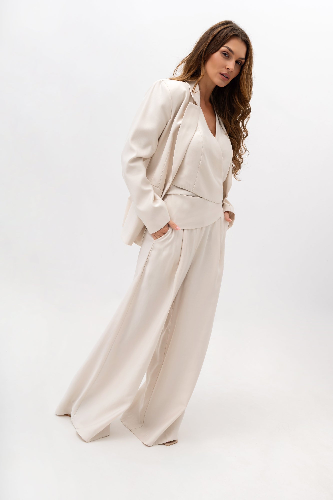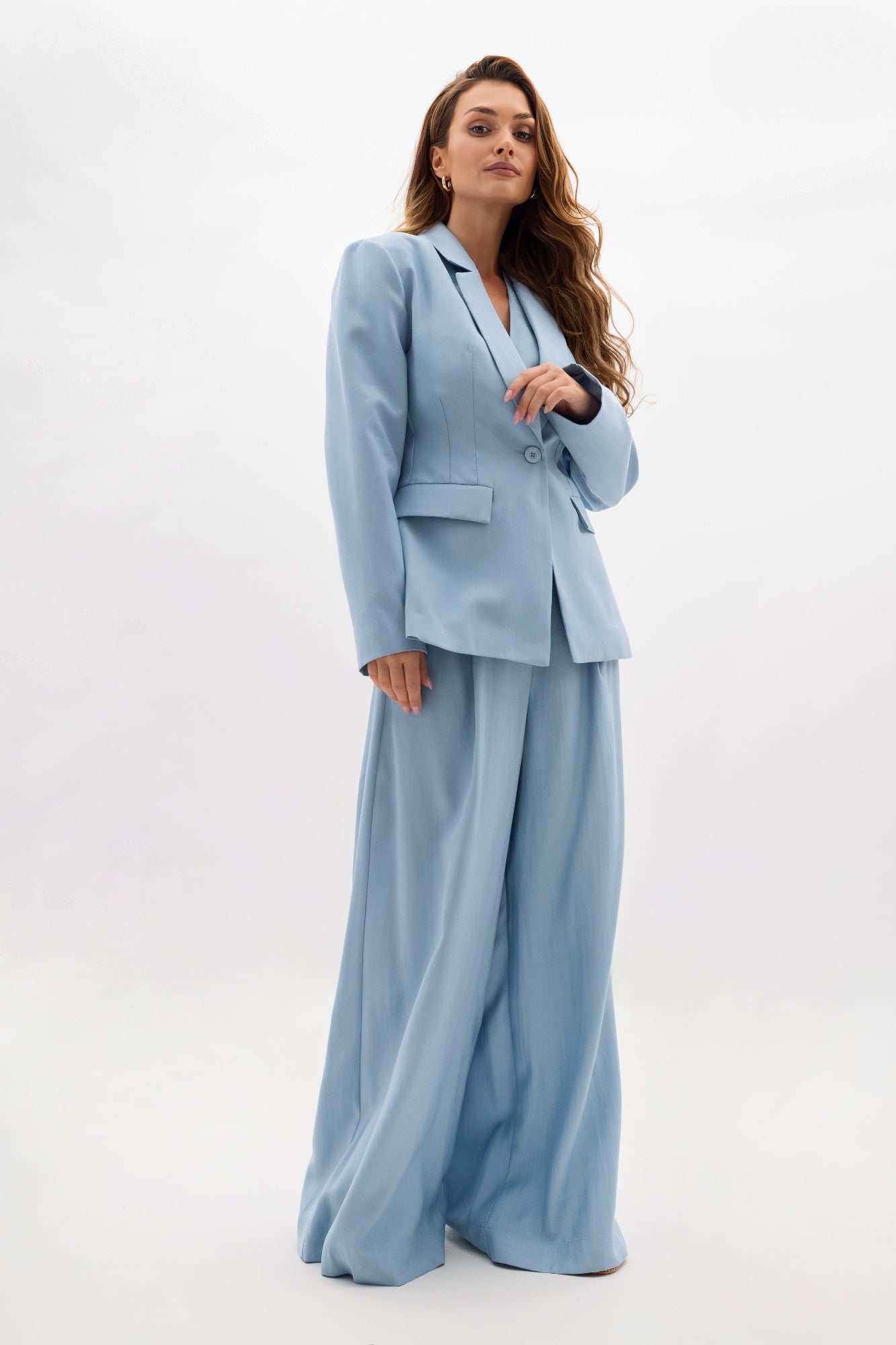 Dzięki wpuszczanym kieszeniom z patkami projekt zyskuje na funkcjonalności, nie tracąc przy tym swojego eleganckiego charakteru. Uniwersalny krój sprawia, że żakiet idealnie współgra zarówno z dopasowanymi spodniami, jak i szerokimi nogawkami czy ołówkową spódnicą. Może stanowić bazę wielu stylizacji – od klasycznych garniturowych zestawów, po bardziej casualowe outfity z jeansami.