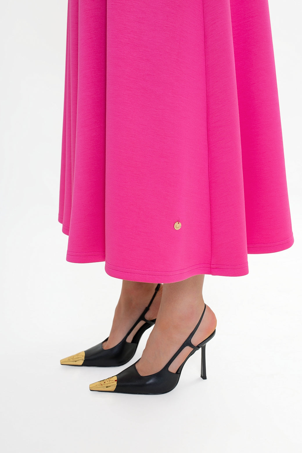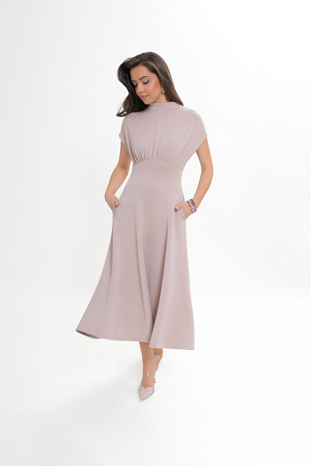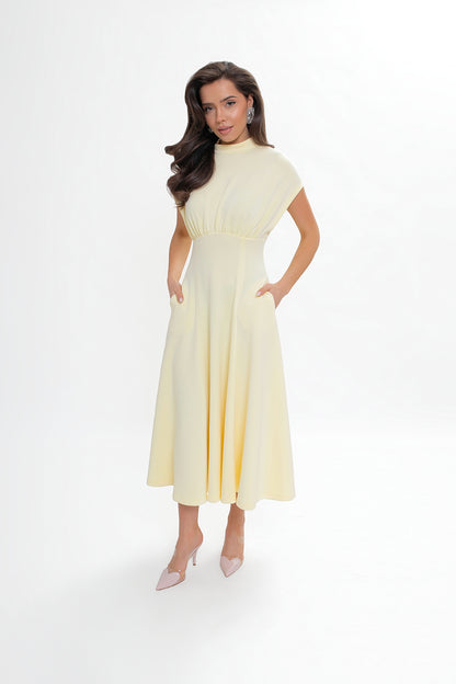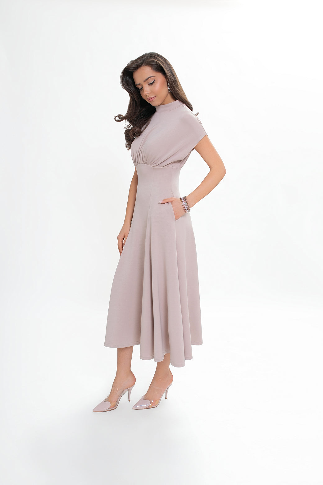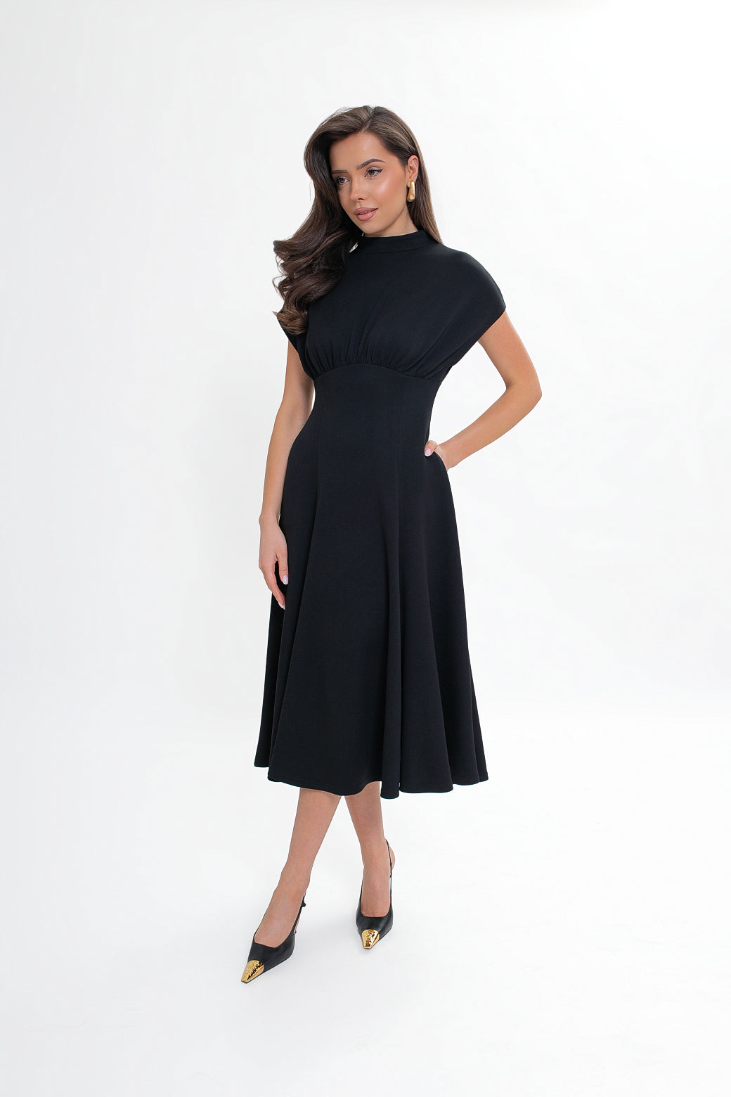 Dół sukienki modelowany klinami dopasowuje się w górnej części i rozkloszowuje ku dołowi, tworząc efektowną, kobiecą linię. W bocznych szwach umieszczono praktyczne kieszenie wpuszczane, które zwiększają funkcjonalność bez zaburzania eleganckiego wyglądu.