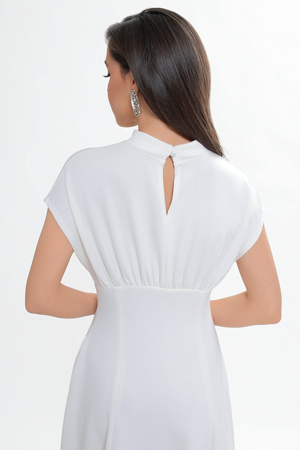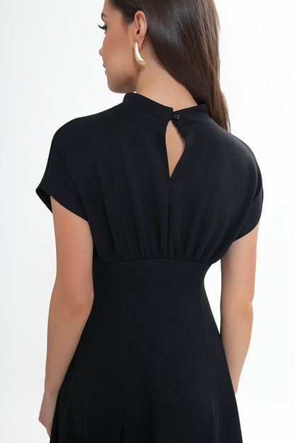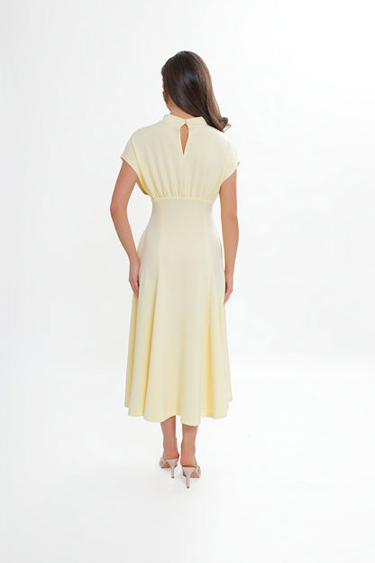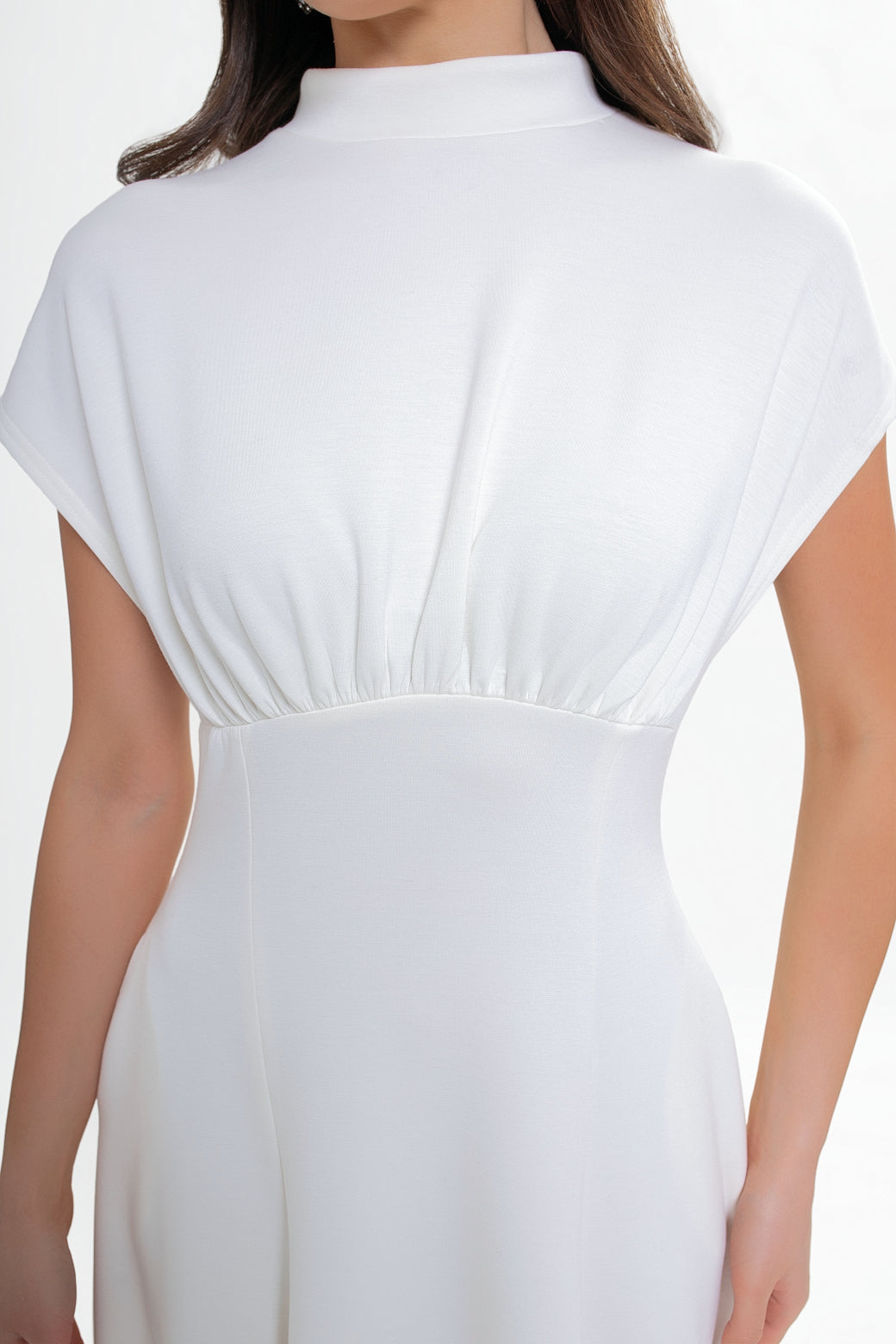 Dekolt w formie subtelnej stójki zapinany z tyłu na pętelkę z guziczkiem nadaje całości eleganckiego charakteru. Z tyłu znajduje się delikatne pęknięcie, które dodaje lekkości i finezji. Góra sukienki z lekko opadającą linią ramion miękko układa się na sylwetce, a marszczenie pod biustem oraz wszyta gumka pięknie podkreślają talię.
