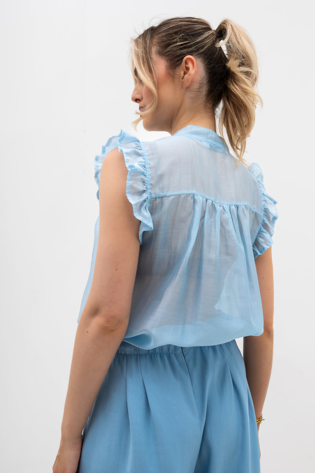 Bluzka z falbankami i stójką – bez rękawów, z tenceluBluzka z falbankami i stójką – bez rękawów, z tencelu