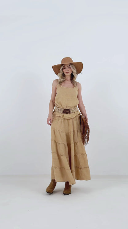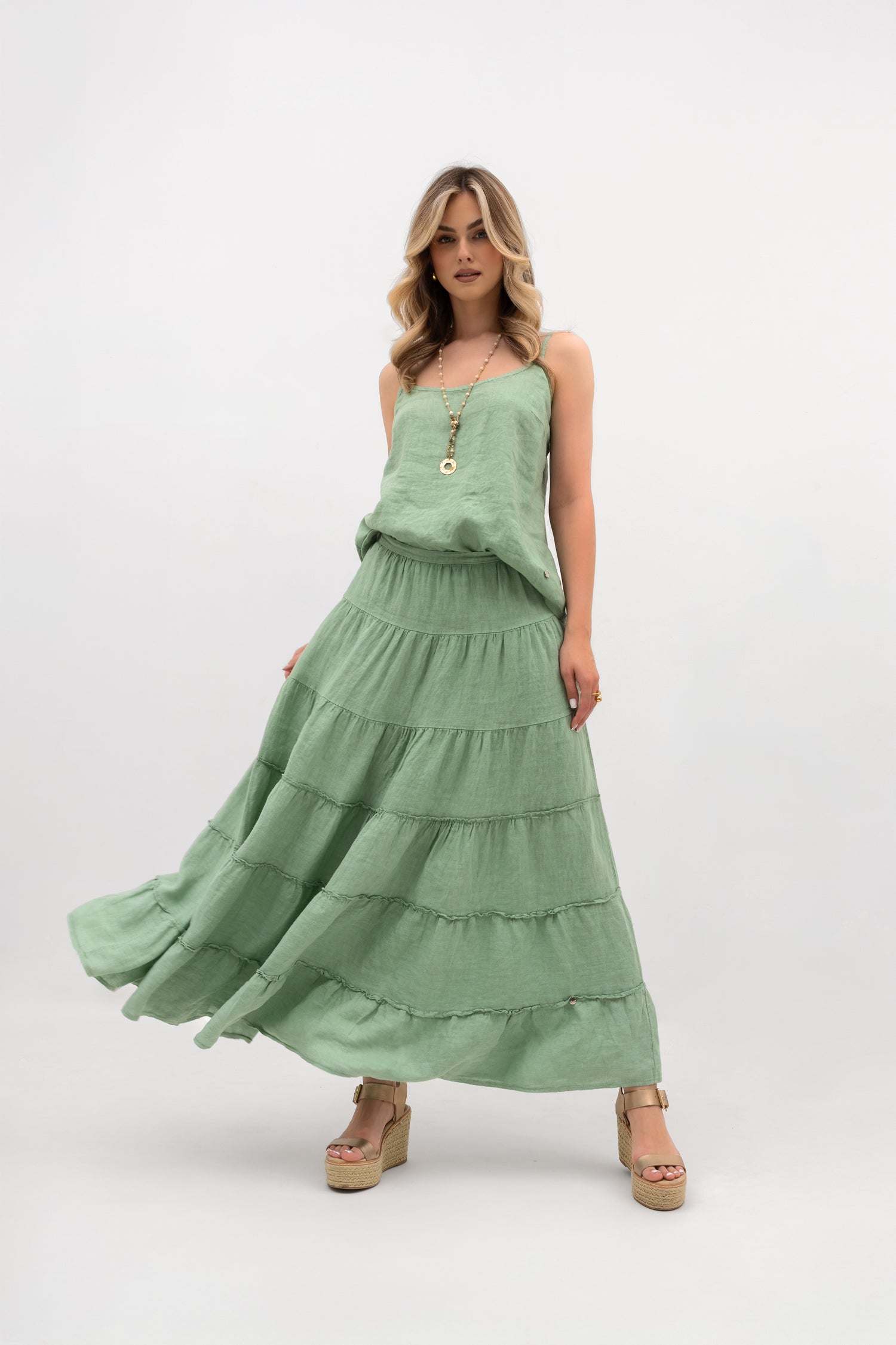 Długa spódnica z naturalnego lnu to propozycja dla kobiet ceniących lekkość, komfort i ponadczasowy styl. Model zbudowany z sześciu efektownych falban pięknie układa się w ruchu, tworząc zwiewną, kobiecą sylwetkę. Delikatna guma w pasie i kryty zamek po boku zapewniają wygodę noszenia oraz idealne dopasowanie do figury.