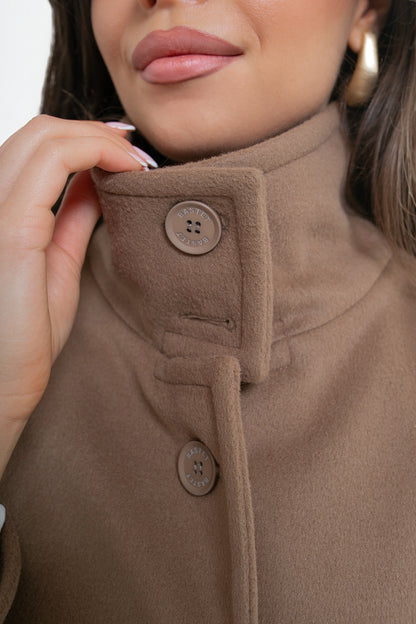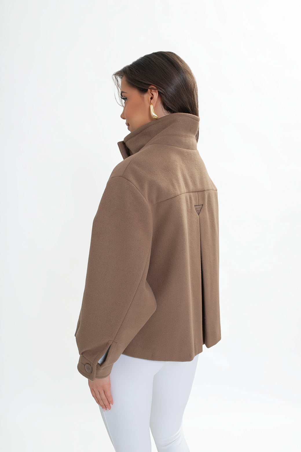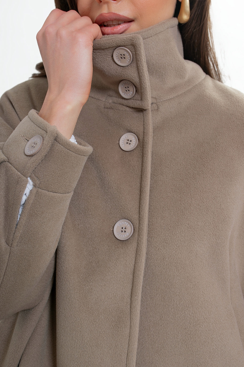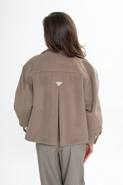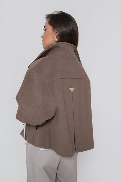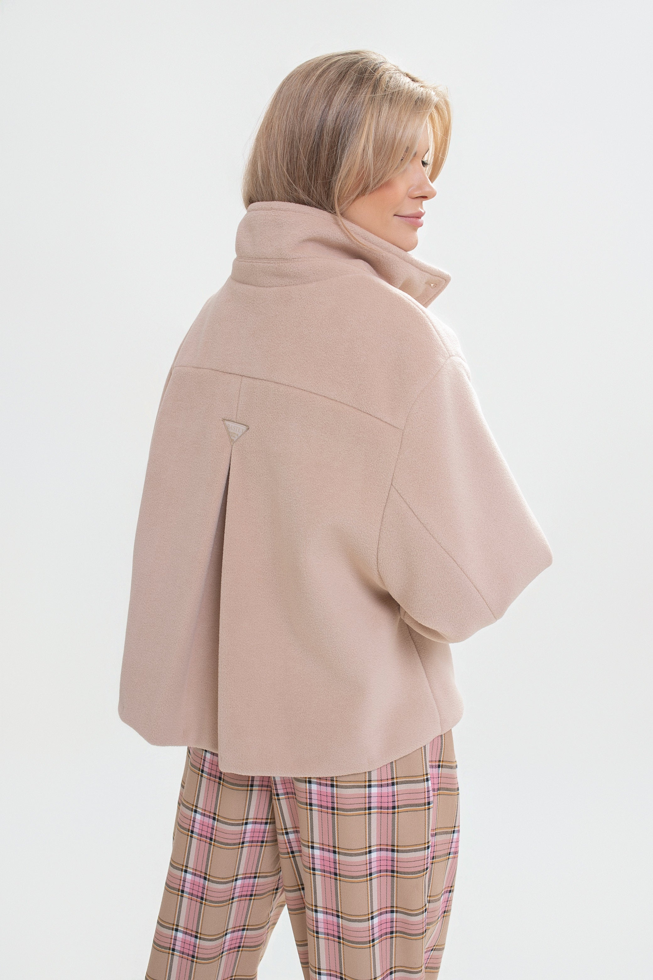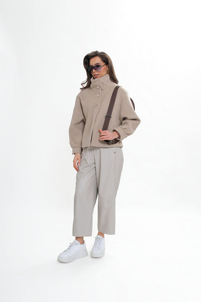 Krótka kurtka z flauszu o nowoczesnym, lekko oversize’owym kroju, który subtelnie buduje sylwetkę i zapewnia wygodę noszenia. Model wyróżnia się wysoką stójką – w tylnej części wszyta została dodatkowa, mniejsza stójka, która nadaje konstrukcji charakteru i eleganckiego wykończenia. Z przodu zapinana na logowane guziki, z podwójnym zapięciem w górnej części.