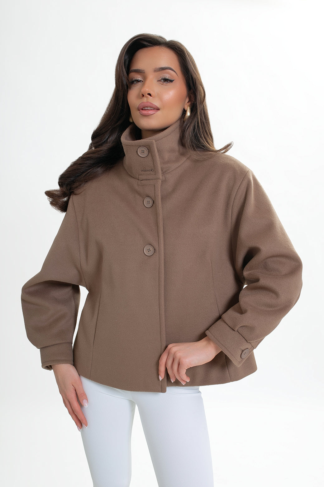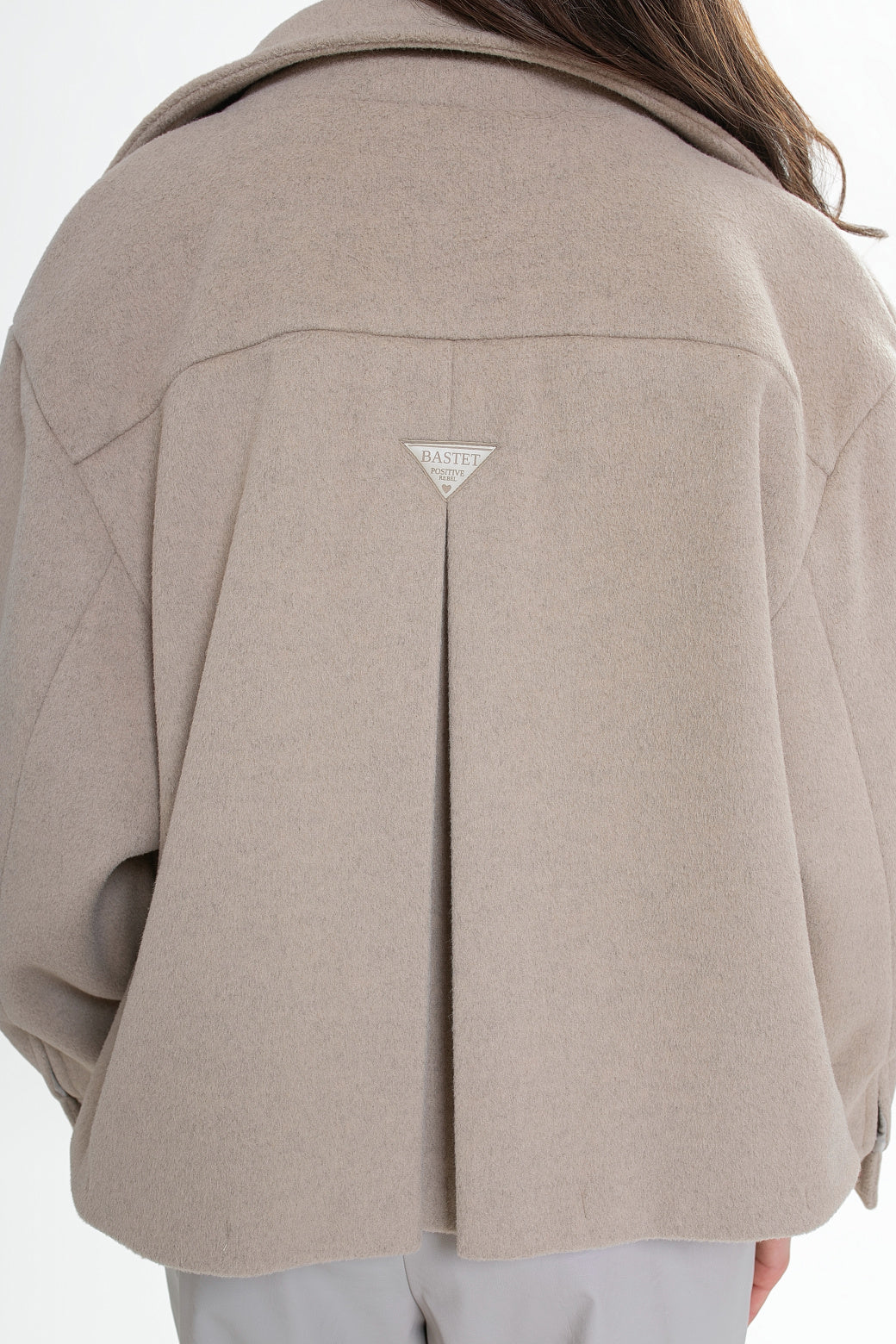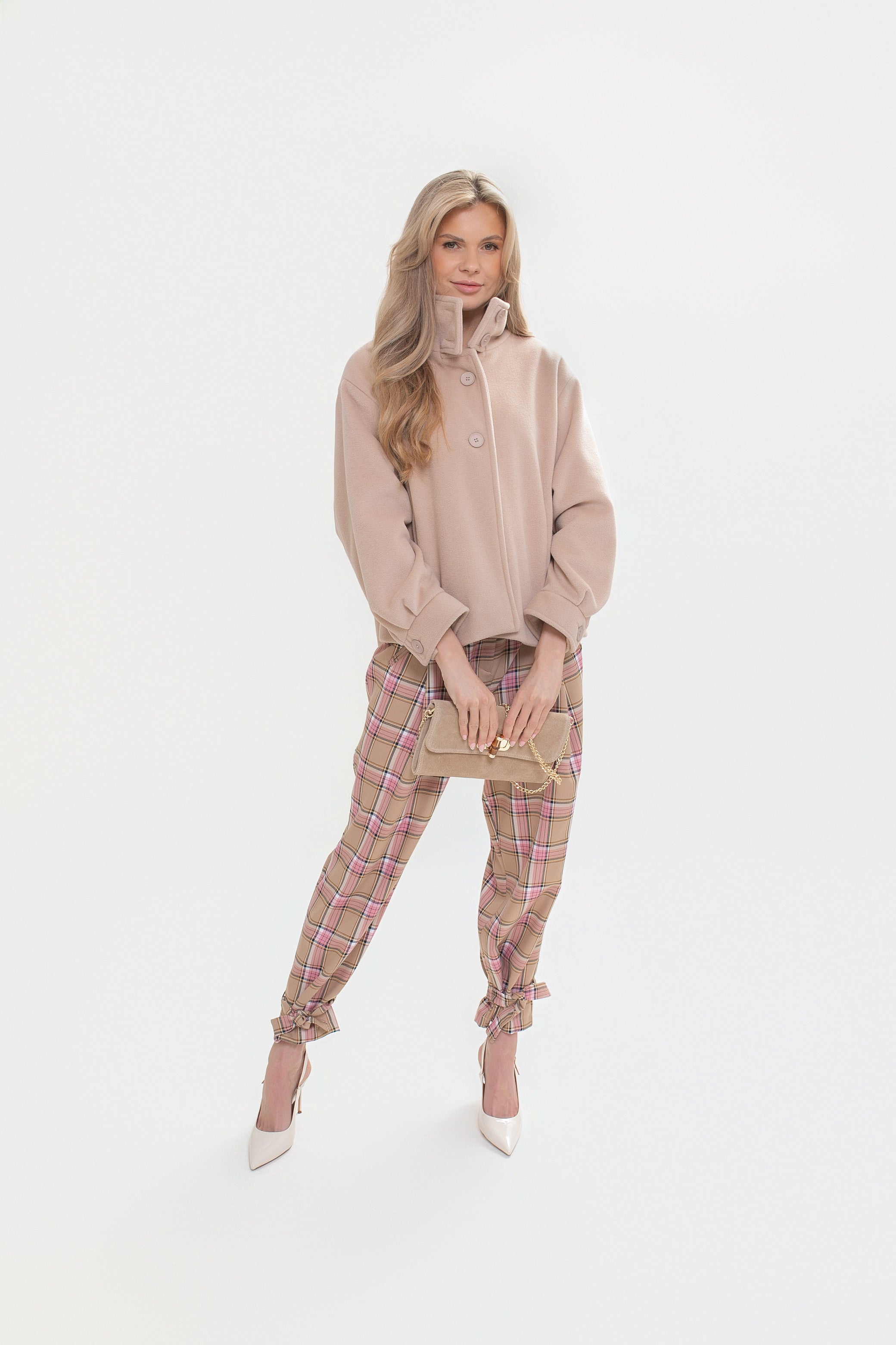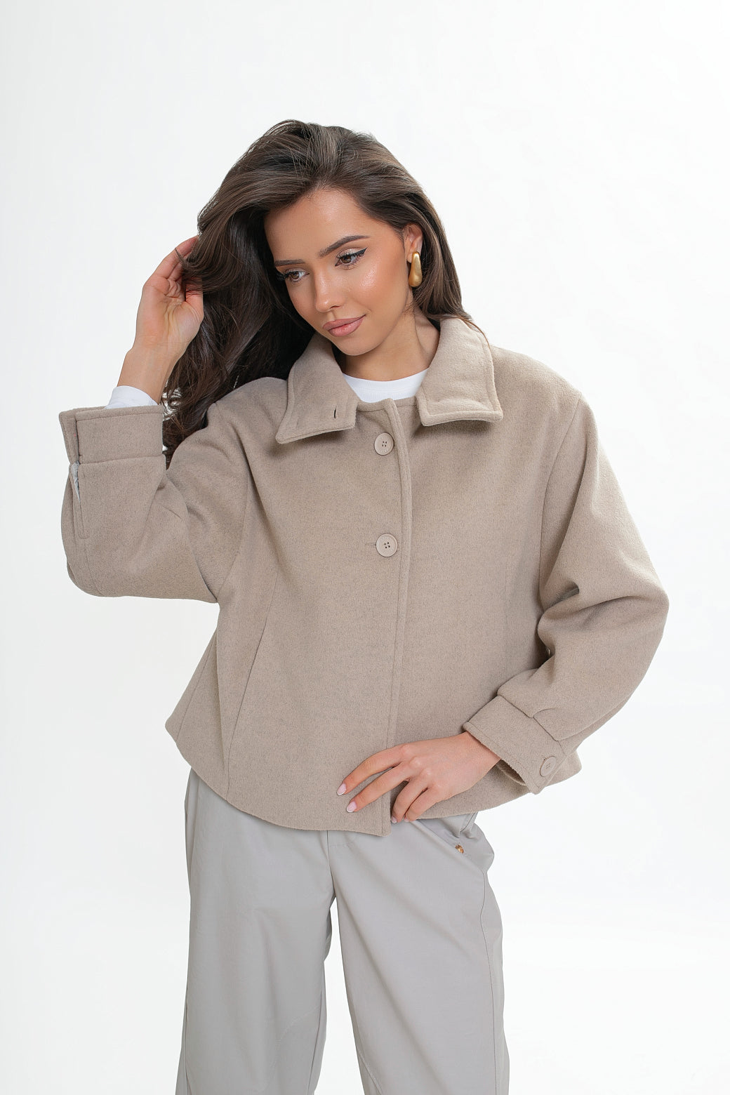 Krótka kurtka z flauszu o nowoczesnym, lekko oversize’owym kroju, który subtelnie buduje sylwetkę i zapewnia wygodę noszenia. Model wyróżnia się wysoką stójką – w tylnej części wszyta została dodatkowa, mniejsza stójka, która nadaje konstrukcji charakteru i eleganckiego wykończenia. Z przodu zapinana na logowane guziki, z podwójnym zapięciem w górnej części.