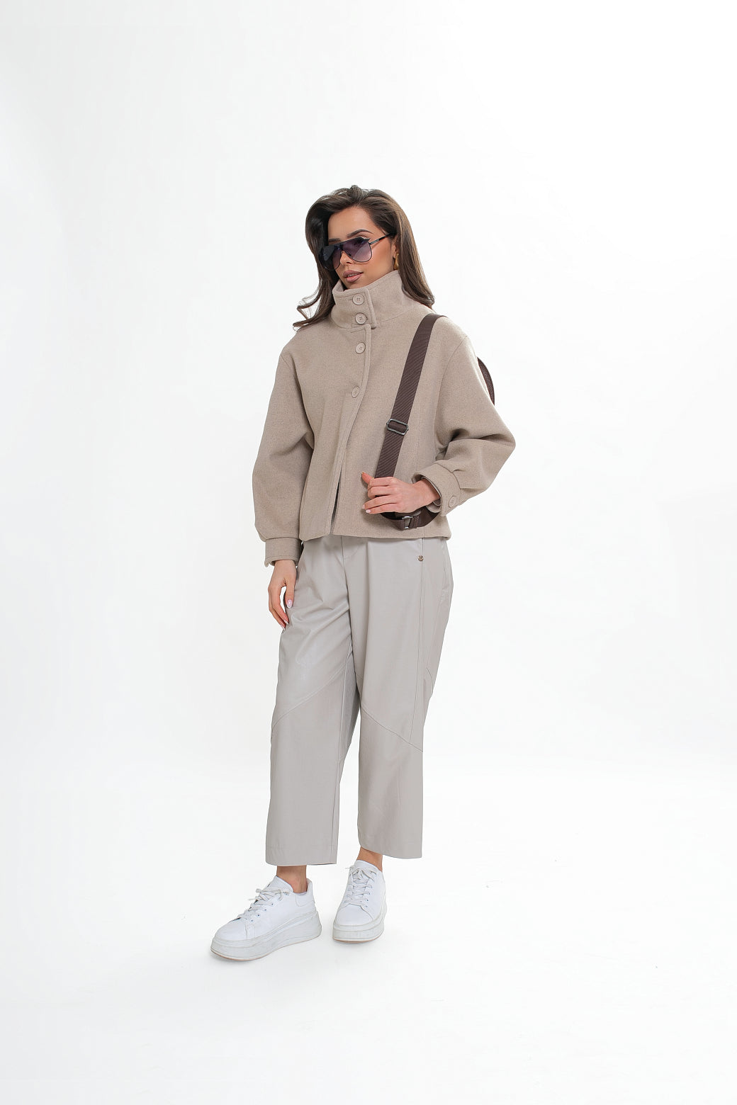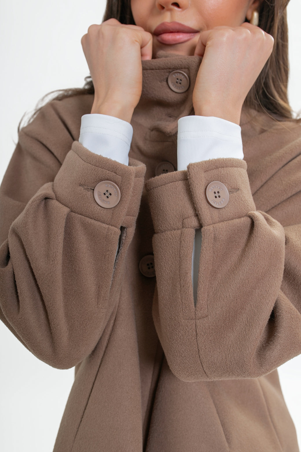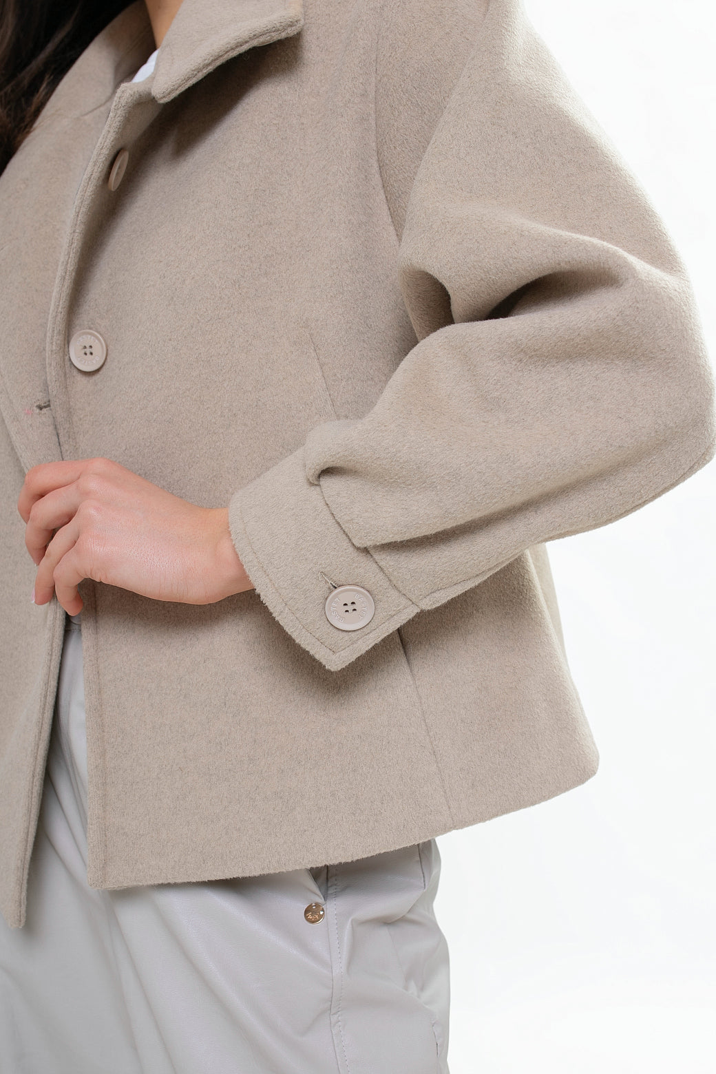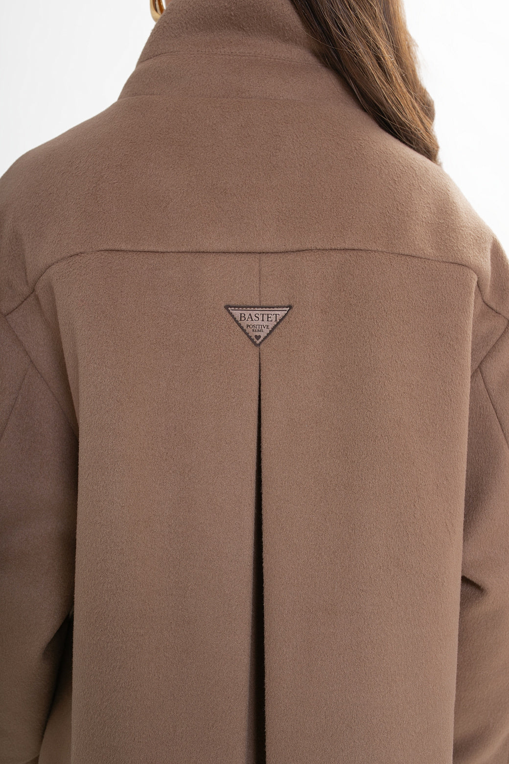 Krótka kurtka z flauszu o nowoczesnym, lekko oversize’owym kroju, który subtelnie buduje sylwetkę i zapewnia wygodę noszenia. Model wyróżnia się wysoką stójką – w tylnej części wszyta została dodatkowa, mniejsza stójka, która nadaje konstrukcji charakteru i eleganckiego wykończenia. Z przodu zapinana na logowane guziki, z podwójnym zapięciem w górnej części.