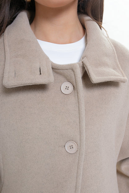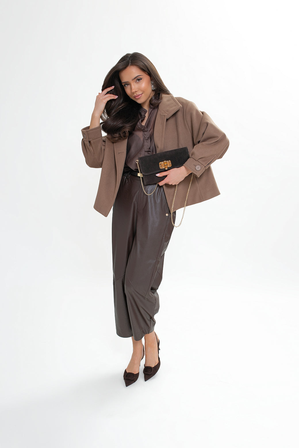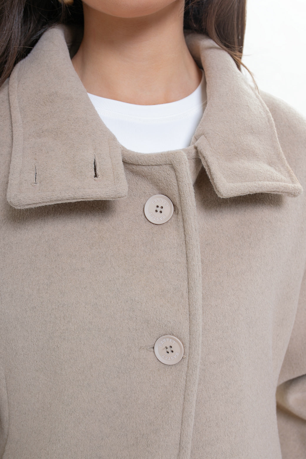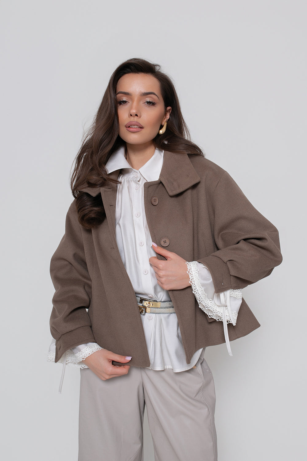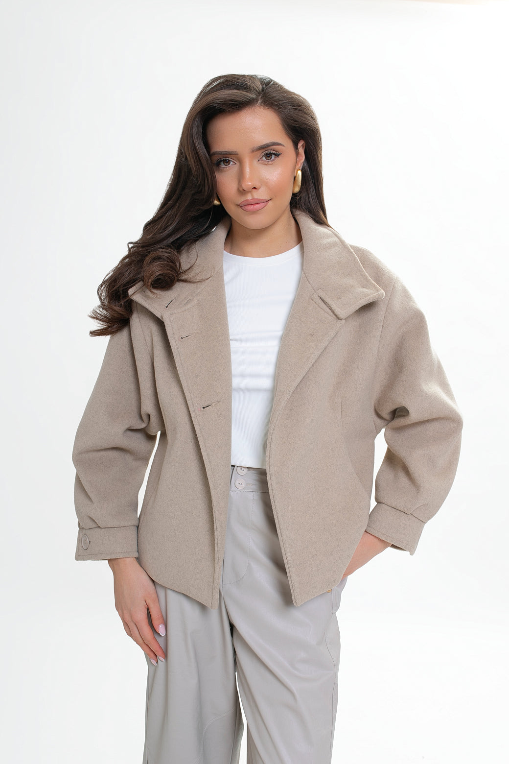 Krótka kurtka z flauszu o nowoczesnym, lekko oversize’owym kroju, który subtelnie buduje sylwetkę i zapewnia wygodę noszenia. Model wyróżnia się wysoką stójką – w tylnej części wszyta została dodatkowa, mniejsza stójka, która nadaje konstrukcji charakteru i eleganckiego wykończenia. Z przodu zapinana na logowane guziki, z podwójnym zapięciem w górnej części.