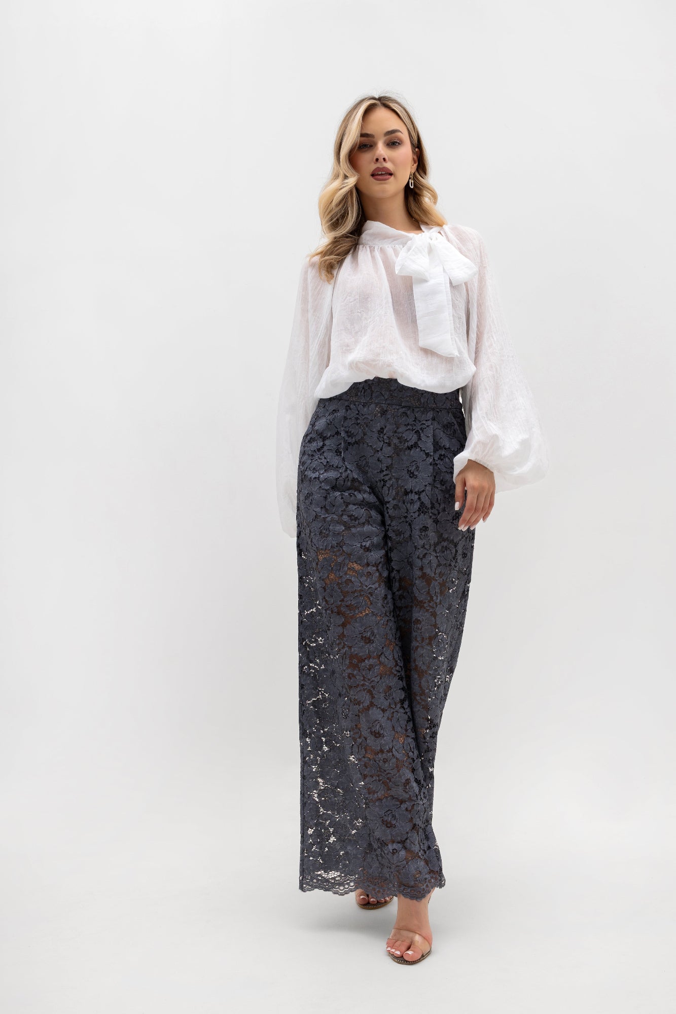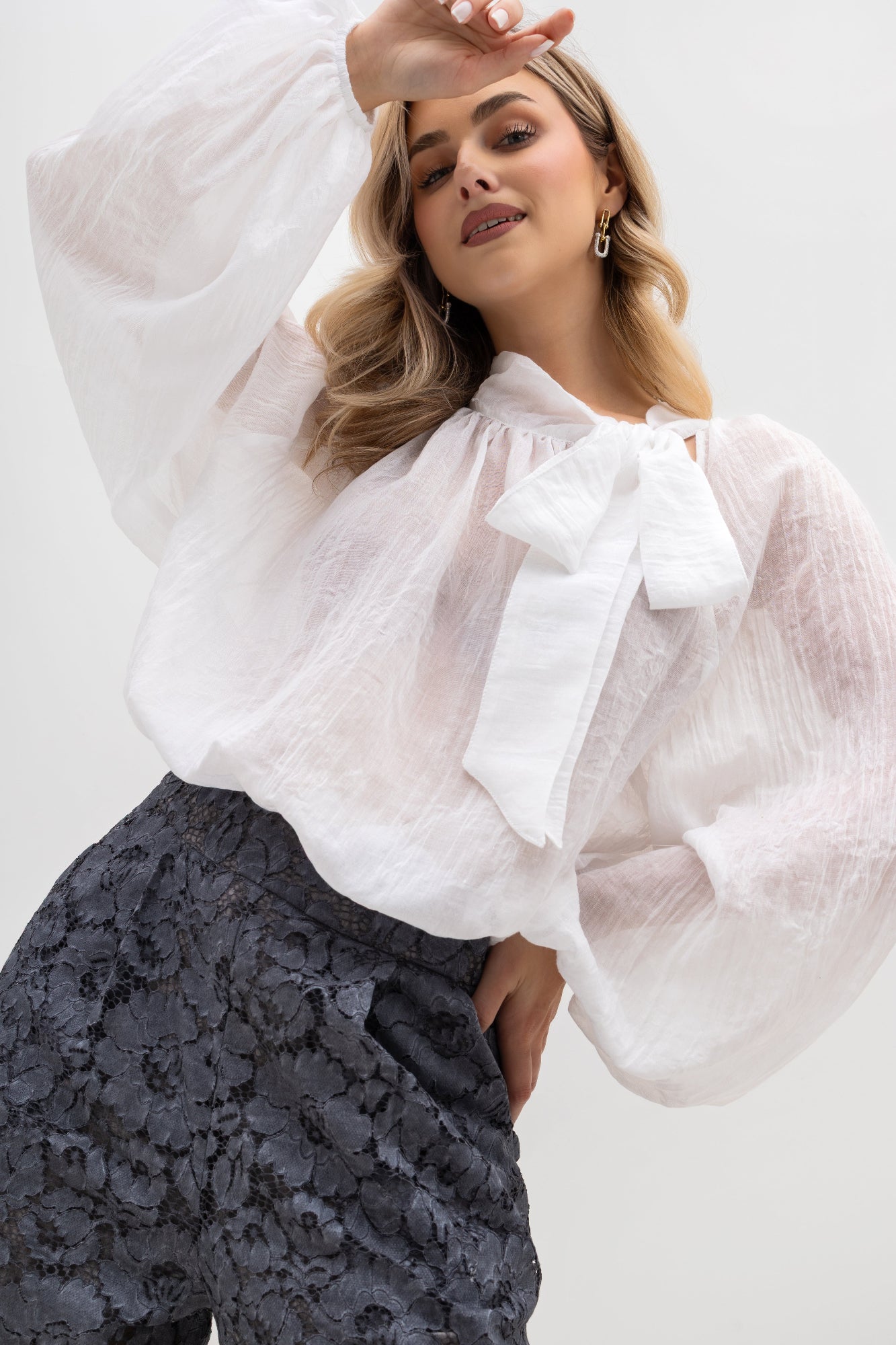 Subtelnie marszczony dekolt przechodzi w niewysoką stójkę, a jego główną ozdobą jest długie wiązanie umieszczone na lewym boku, które możesz zawiązać w nonszalancki węzeł lub efektowną, dużą kokardę, nadając stylizacji indywidualnego charakteru. Prosty, luźny dół sprawia, że bluzka świetnie wygląda zarówno wpuszczona w spodnie, jak i noszona swobodnie.