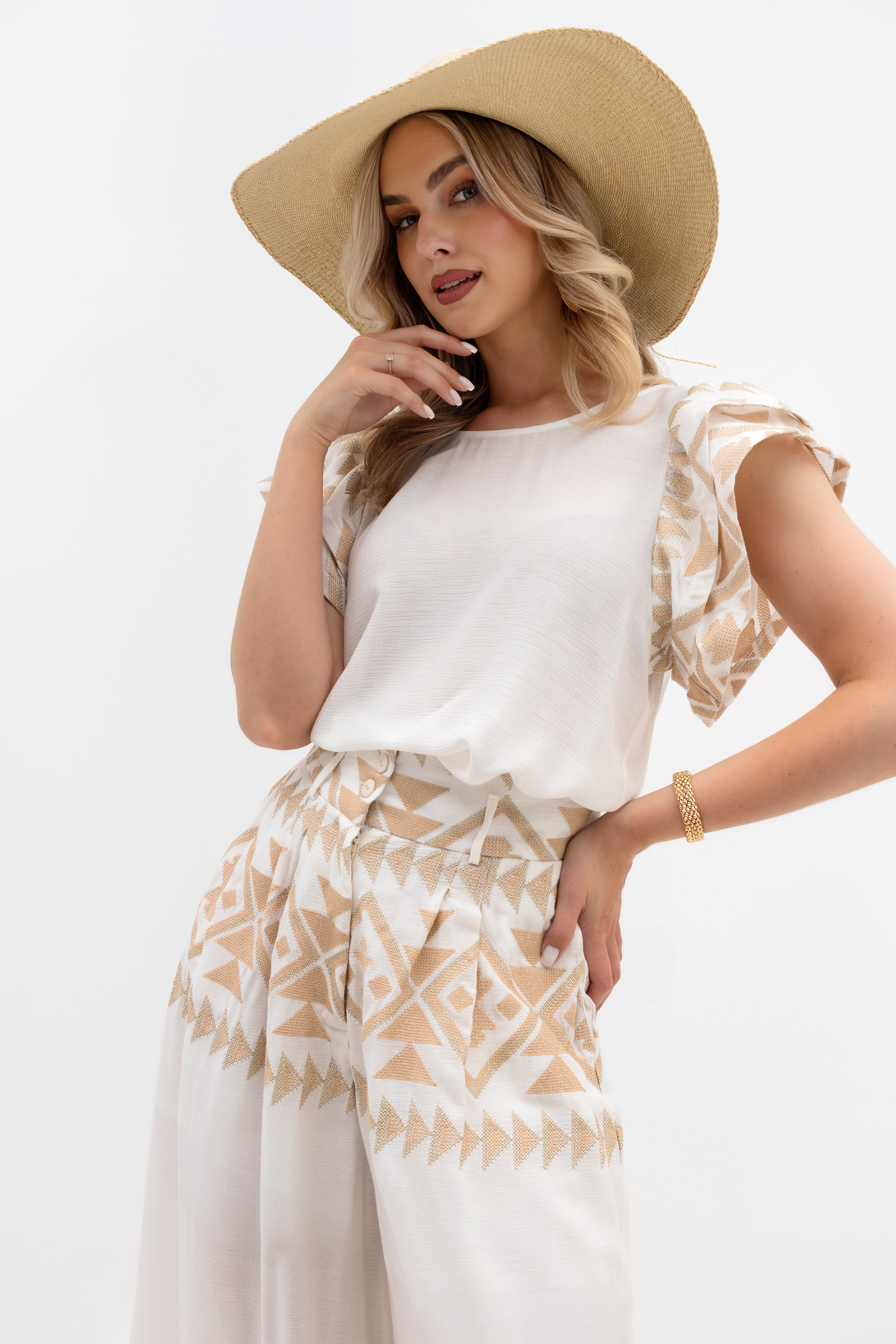 Das absolute Highlight dieses Modells ist der aufwendig bestickte obere Teil der Hose. Ein breiter Bund mit geometrischem, ethnisch anmutendem Muster verleiht ihr einen einzigartigen, künstlerischen Charakter. Zarte Falten vorne sorgen für klassische Eleganz und einen wunderschönen Fall des Stoffes. Das gesamte Kleidungsstück wird mit zwei Zierknöpfen geschlossen. Auch an den Tragekomfort haben wir gedacht – praktische Taschen sind in den Seitennähten versteckt.
