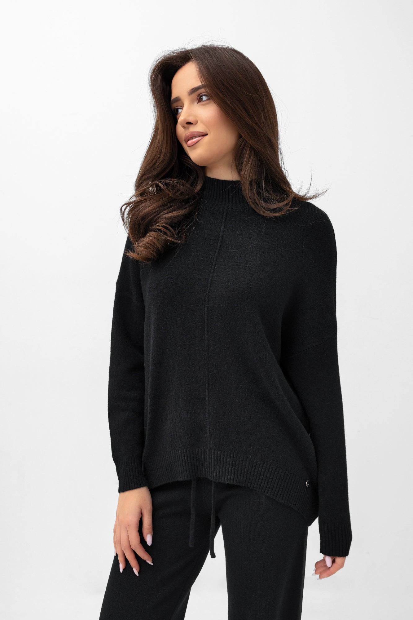 The mock turtleneck sweater features a decorative stitching down the center, adding a subtle touch. The back is slightly longer than the front, creating a lighter silhouette, while ribbed cuffs and hemline accentuate the finished look. Straight-leg trousers with an elastic waistband perfectly complement the ensemble, creating a cohesive look that's ready to wear both at home and with streetwear.