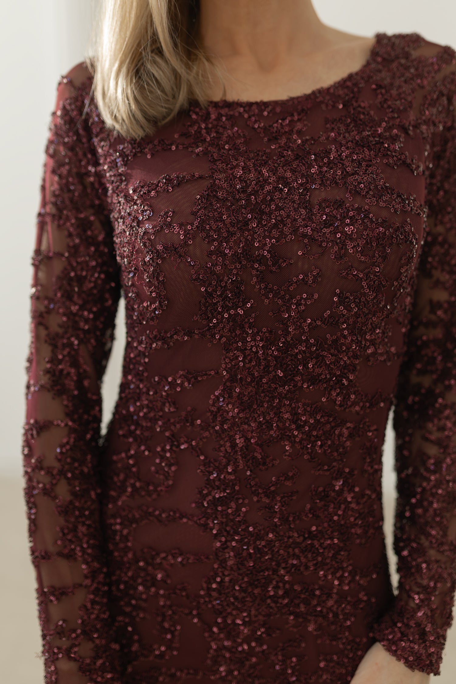 Od spodu wszyto miękką podszewkę z siatki (z przodu i z tyłu), dzięki czemu sukienka jest wygodna, nie prześwituje i świetnie układa się na ciele. To model, który łączy luksusowy połysk z wygodą i funkcjonalnością — idealny wybór dla kobiet, które chcą błyszczeć w wielkim stylu.