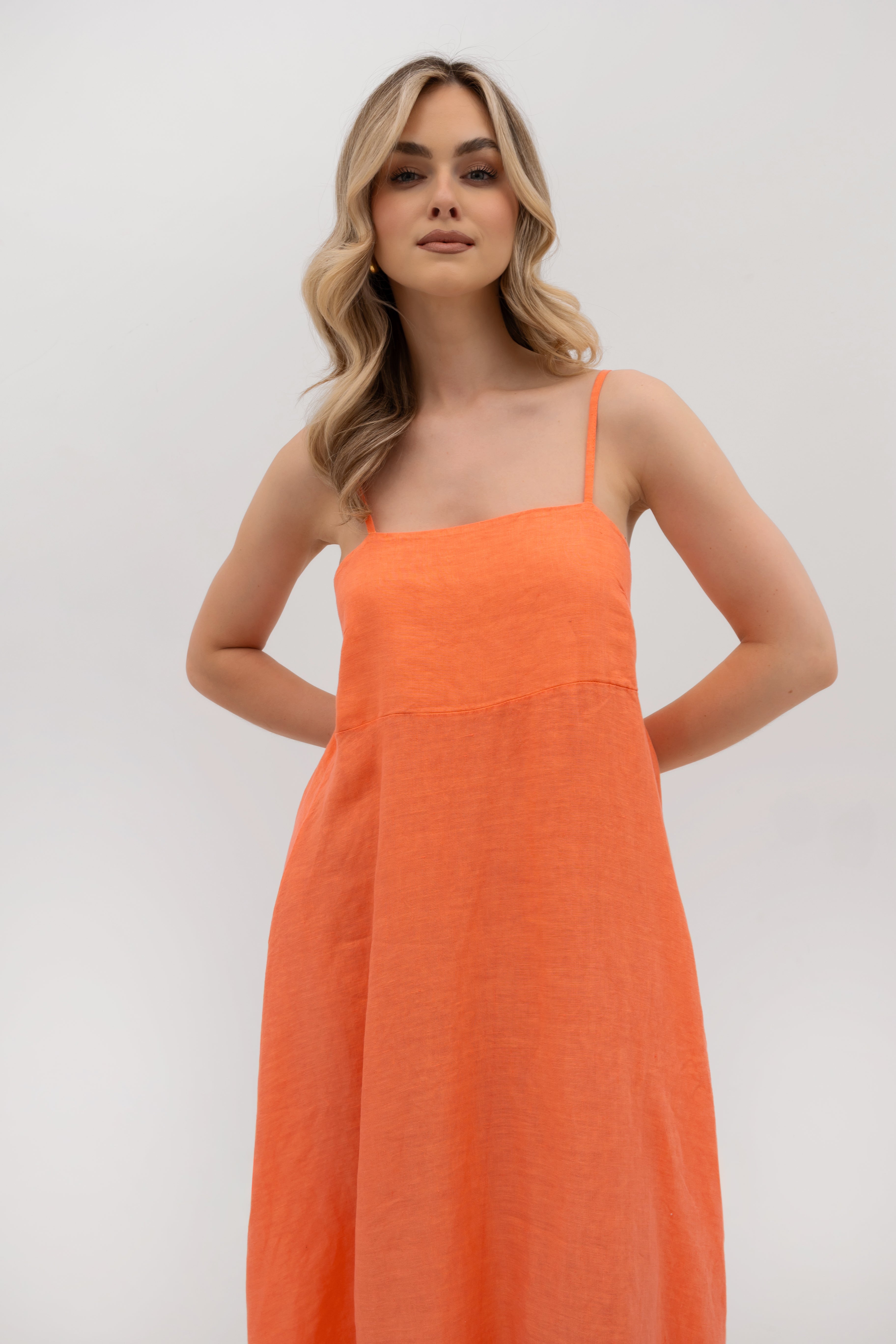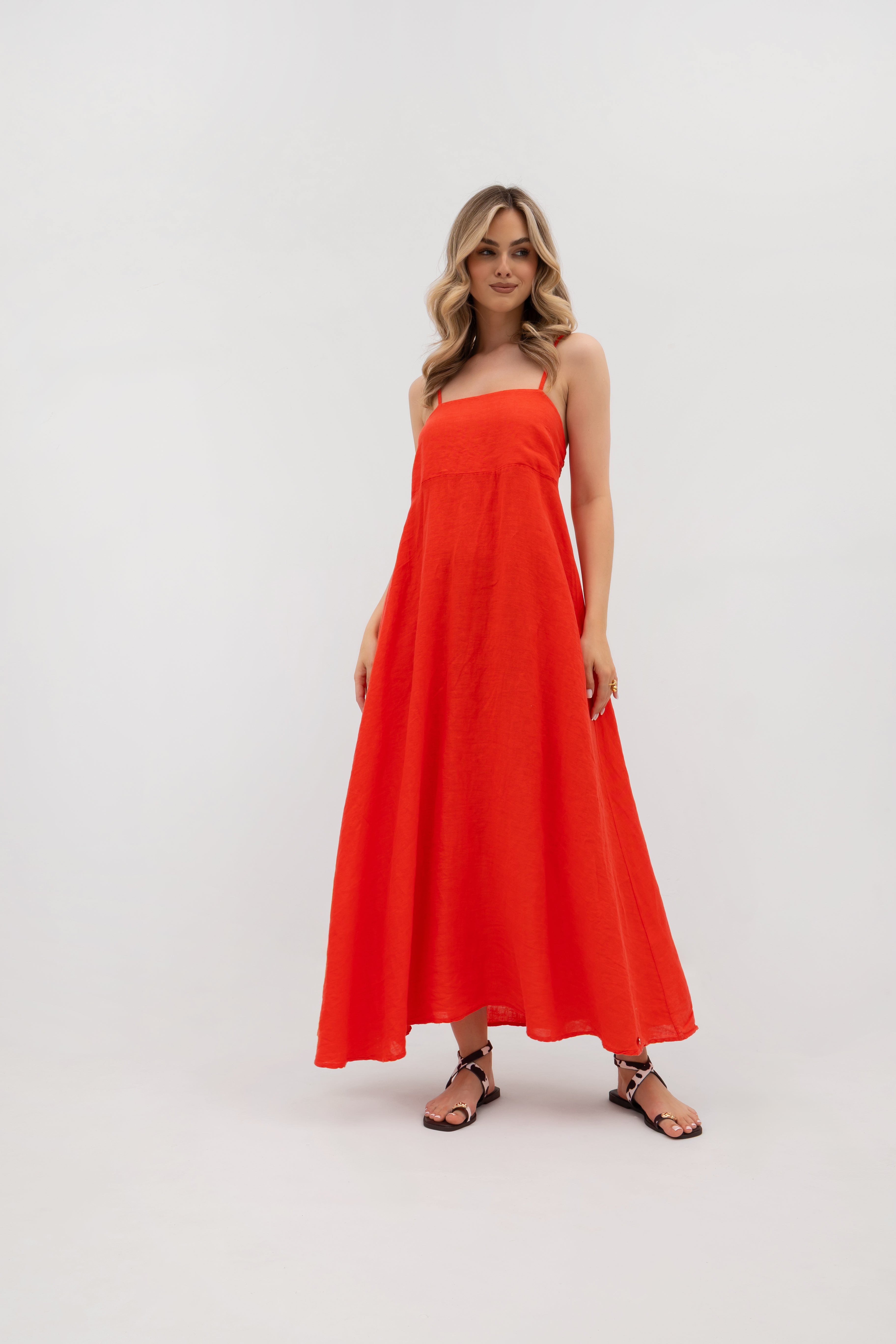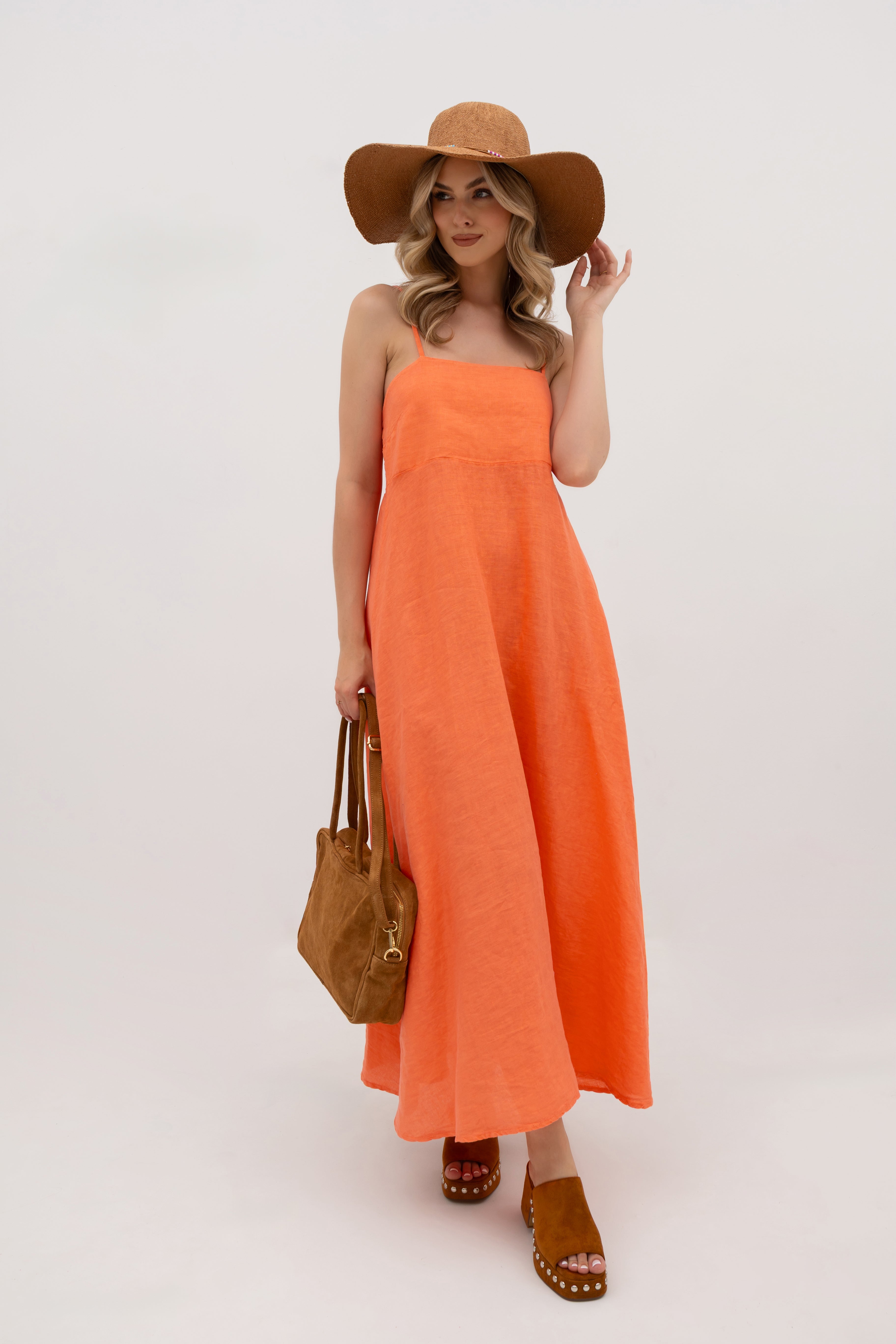 This summer linen dress in an intense shade is the quintessence of feminine ease and elegance in a minimalist style. Thin, adjustable straps ensure a perfect fit, while an elastic waistband at the back accentuates the silhouette and guarantees comfort.