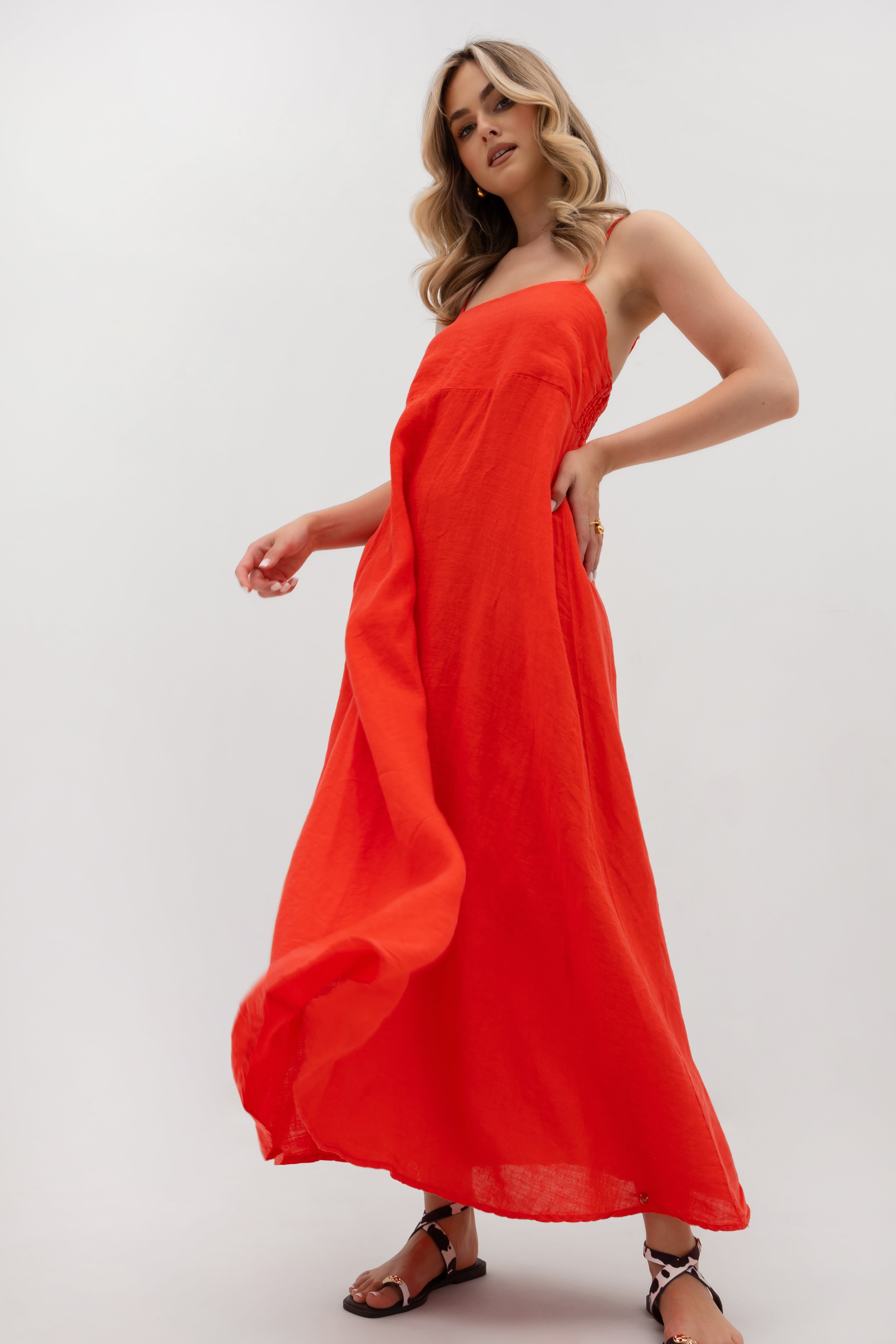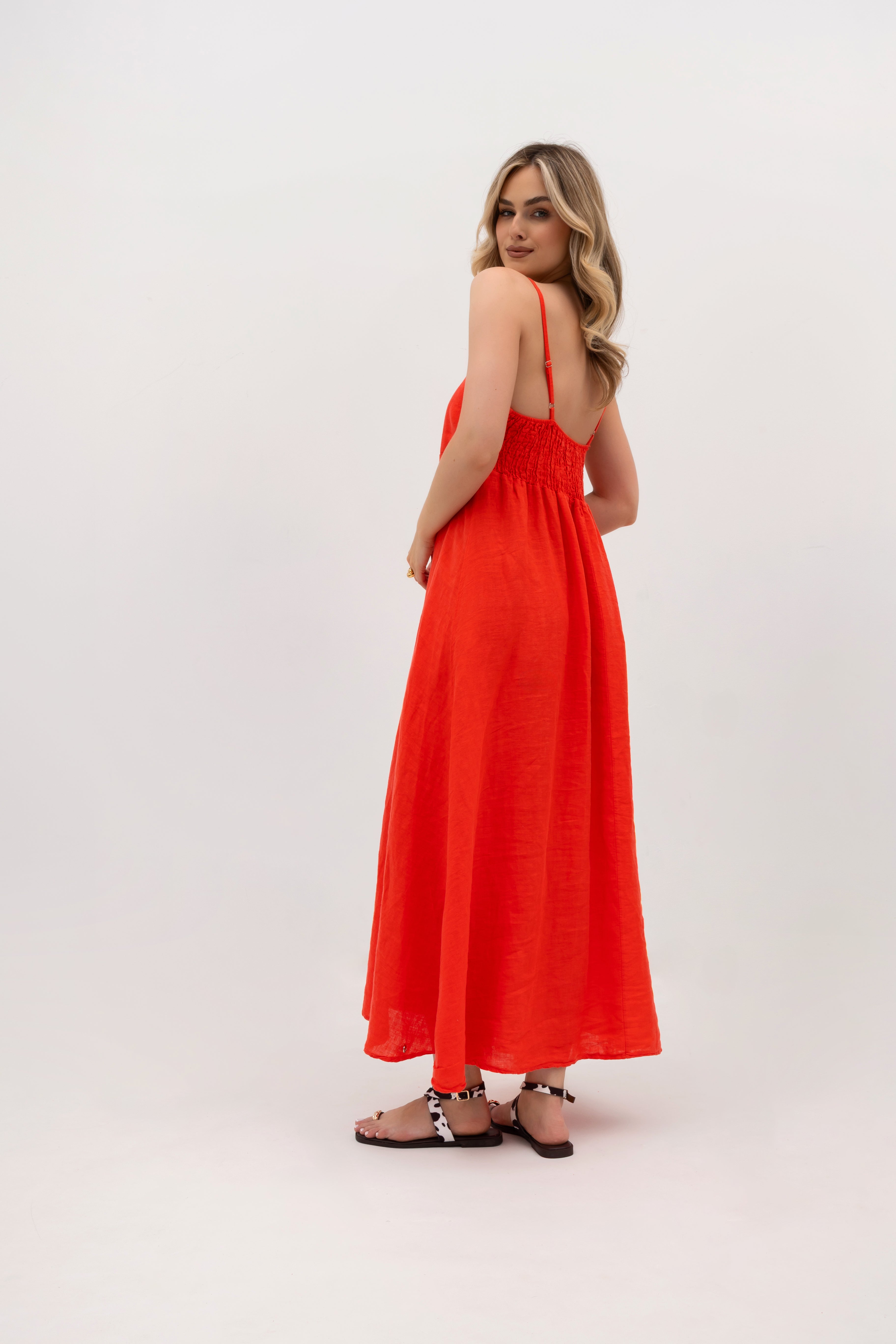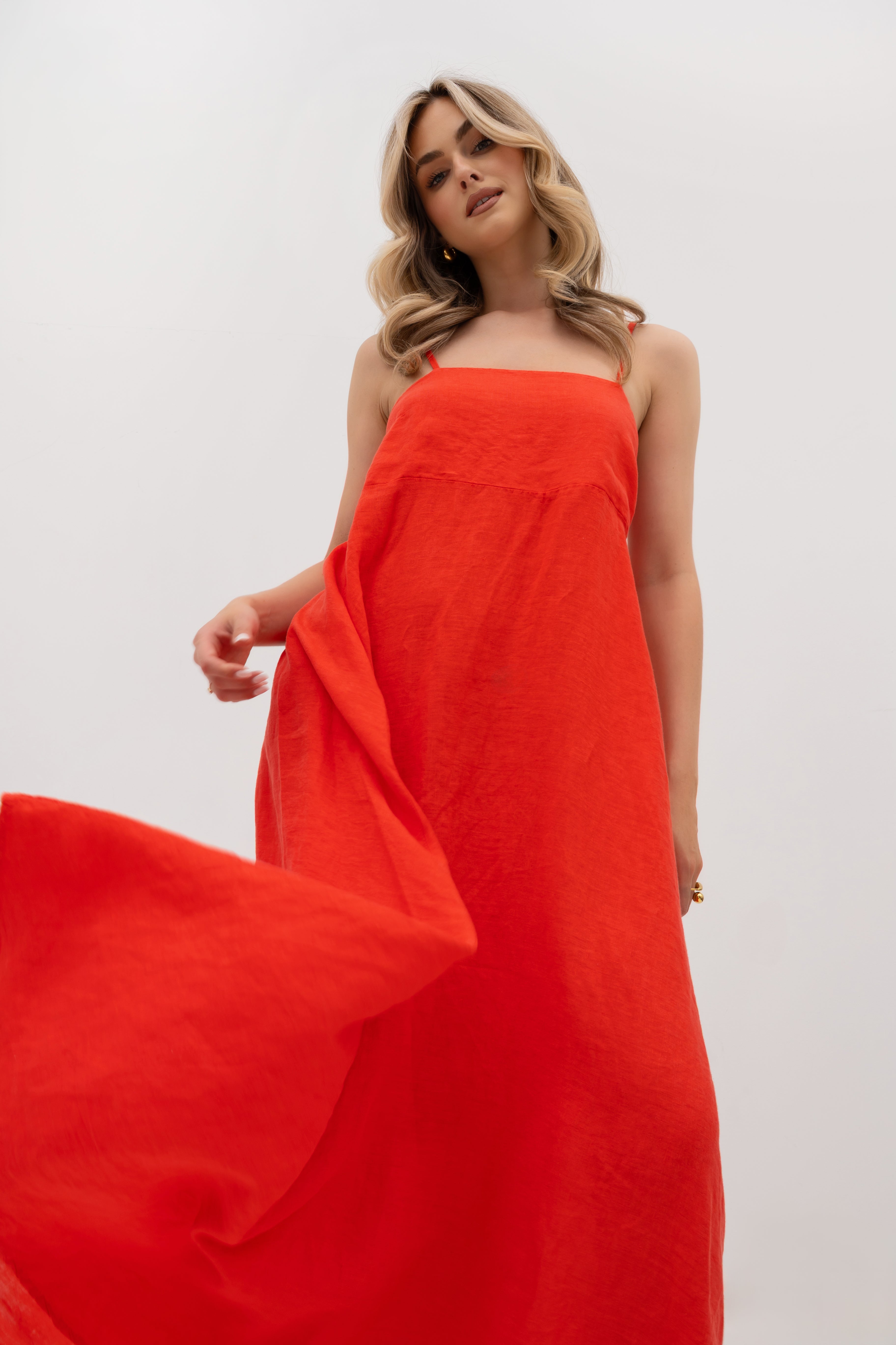 This summer linen dress in an intense shade is the quintessence of feminine ease and elegance in a minimalist style. Thin, adjustable straps ensure a perfect fit, while an elastic waistband at the back accentuates the silhouette and guarantees comfort.