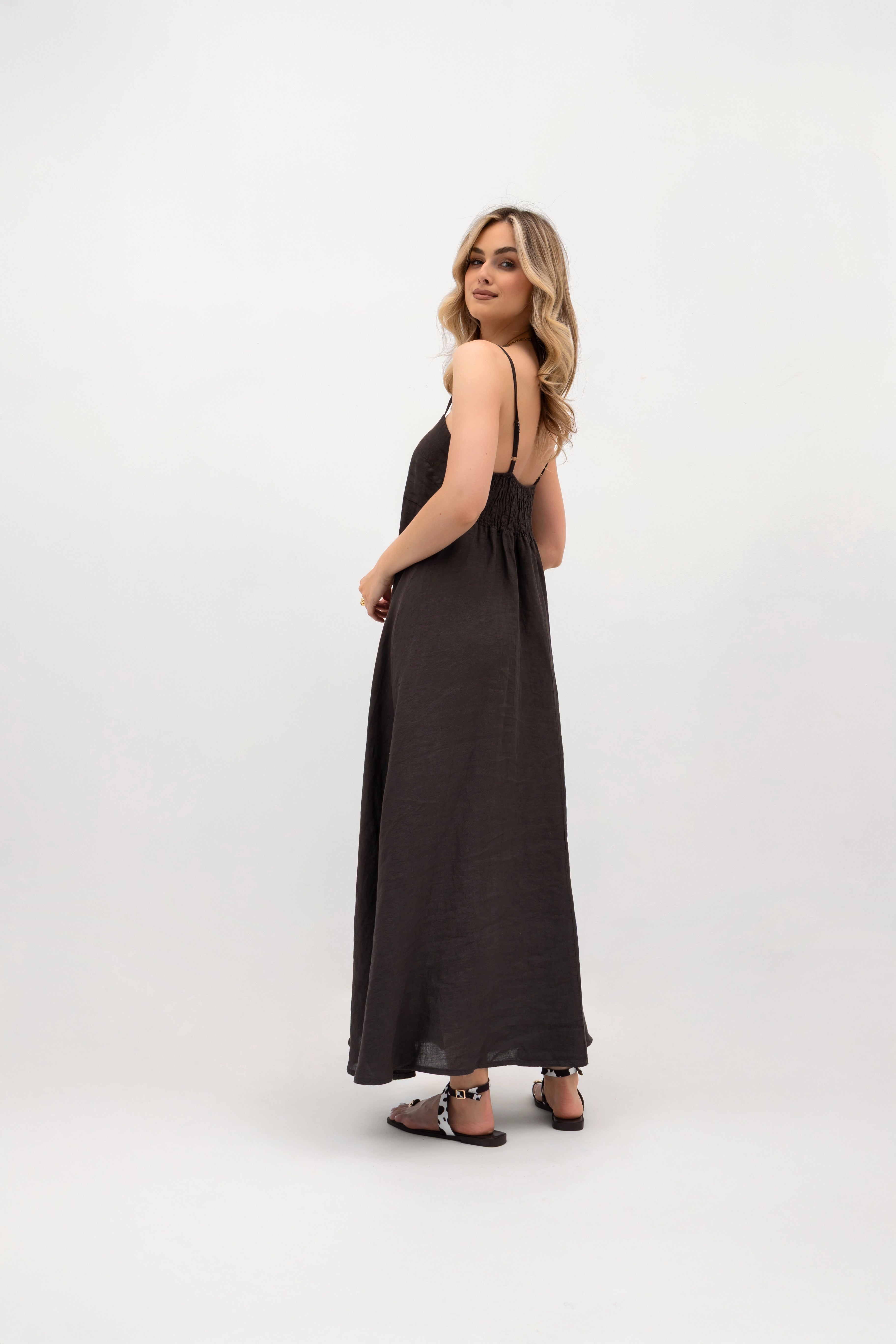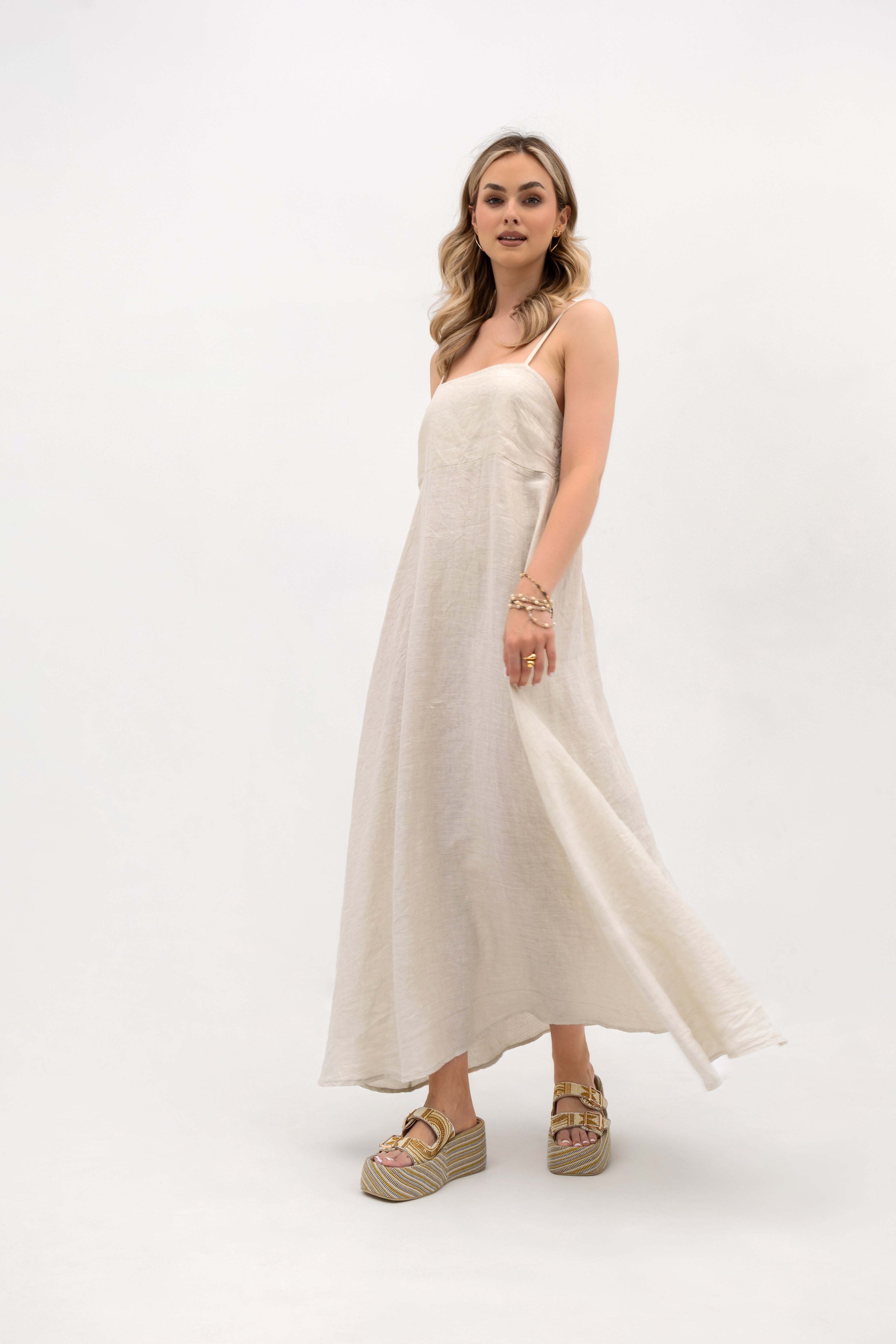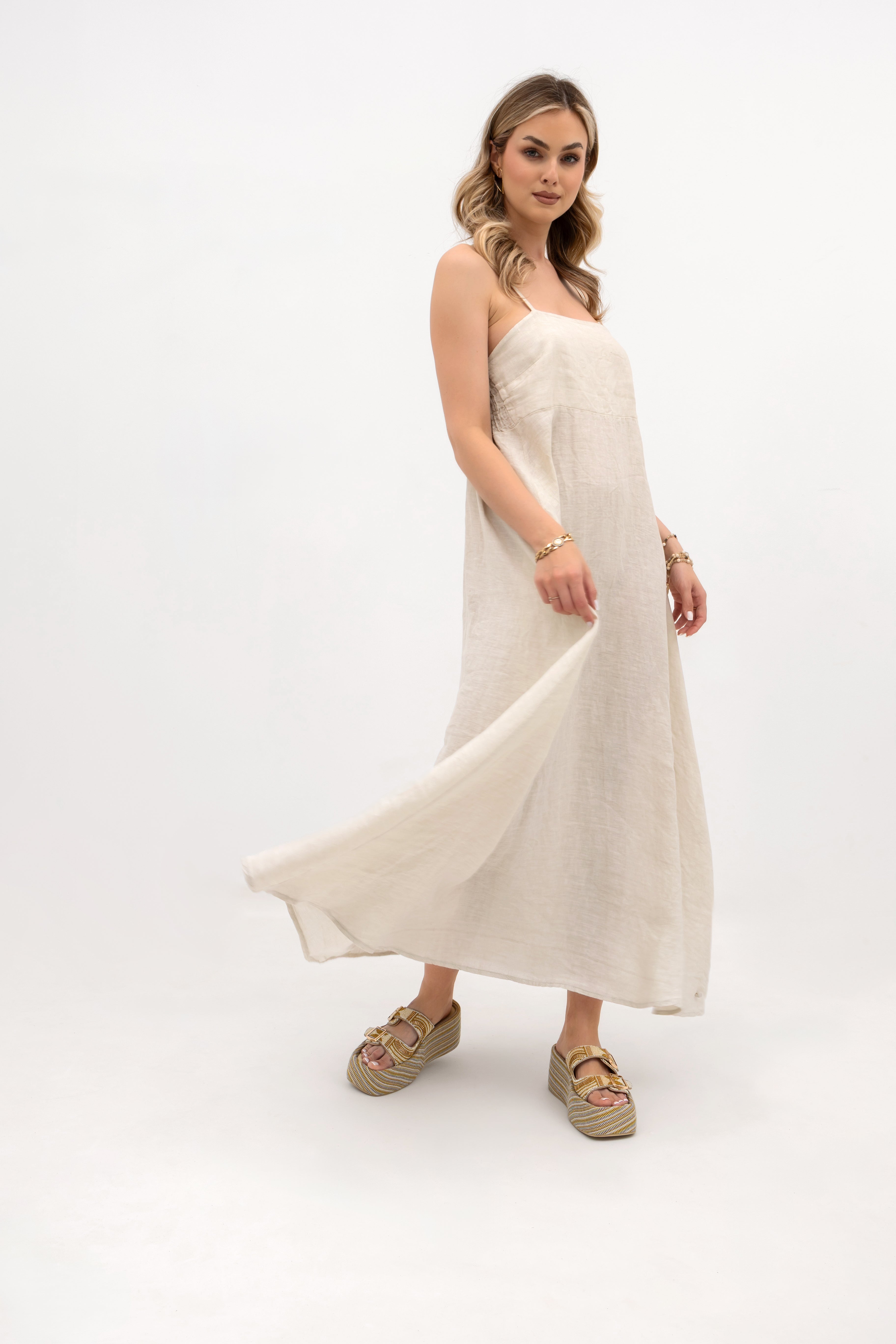 The cut, cut just below the bust, with a slightly flared A-line hem, flows beautifully and provides maximum breathability – perfect for hot days. The natural, 100% linen makes the material breathable, keeping skin dry even in the hottest temperatures.