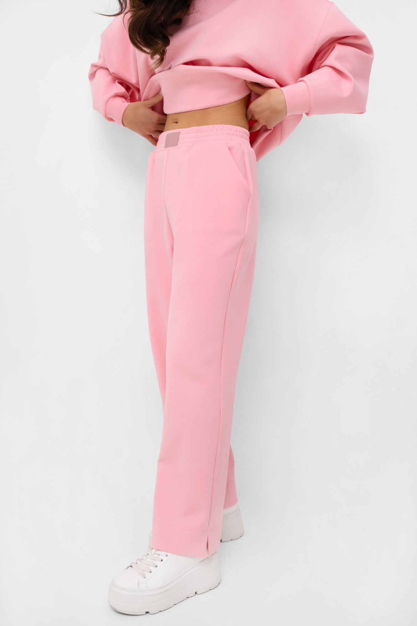 Sekretem ich wyjątkowości jest przemyślany fason z prostą nogawką, który optycznie wydłuża sylwetkę i pasuje do każdej figury. Szeroki, 5-centymetrowy pas z gumą został z przodu wykończony na płasko, dzięki czemu spodnie pięknie układają się pod bluzkami i nie tworzą niepotrzebnej objętości. Dyskretne rozcięcia po bokach nogawek to stylowy detal, który dodaje całości lekkości.
