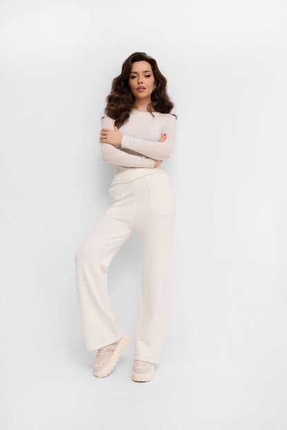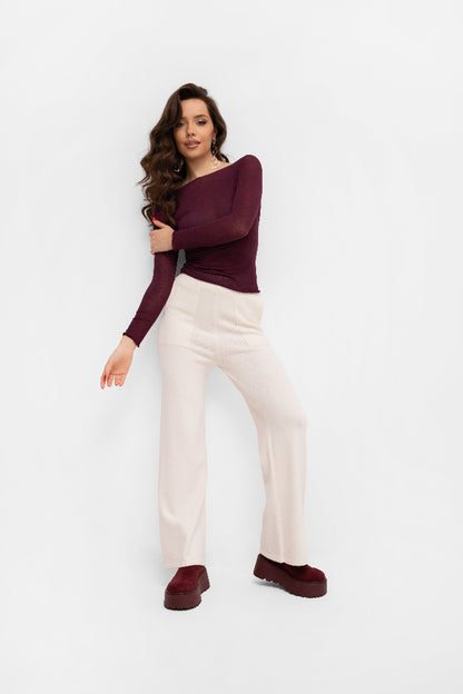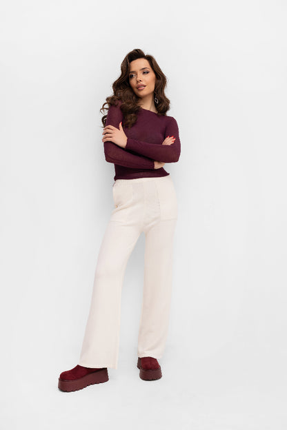 Dół, rękawy oraz wykończenie przy szyi wykonane są dekoracyjnym ściegiem mereżkowym, który dodaje całości finezji i kobiecego charakteru. Cienka, elastyczna dzianina pięknie układa się na sylwetce i stanowi doskonałą bazę do wielu stylizacji – zarówno tych codziennych, jak i bardziej eleganckich.
