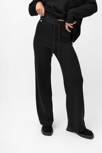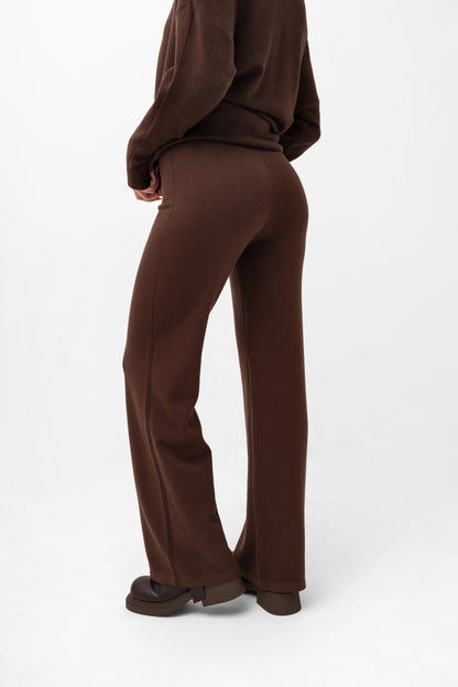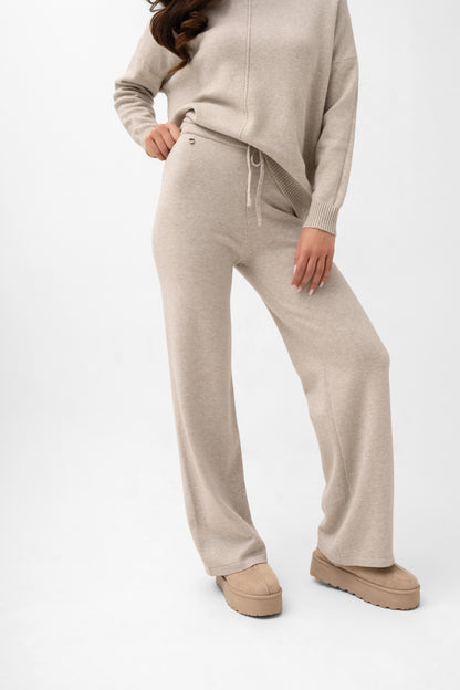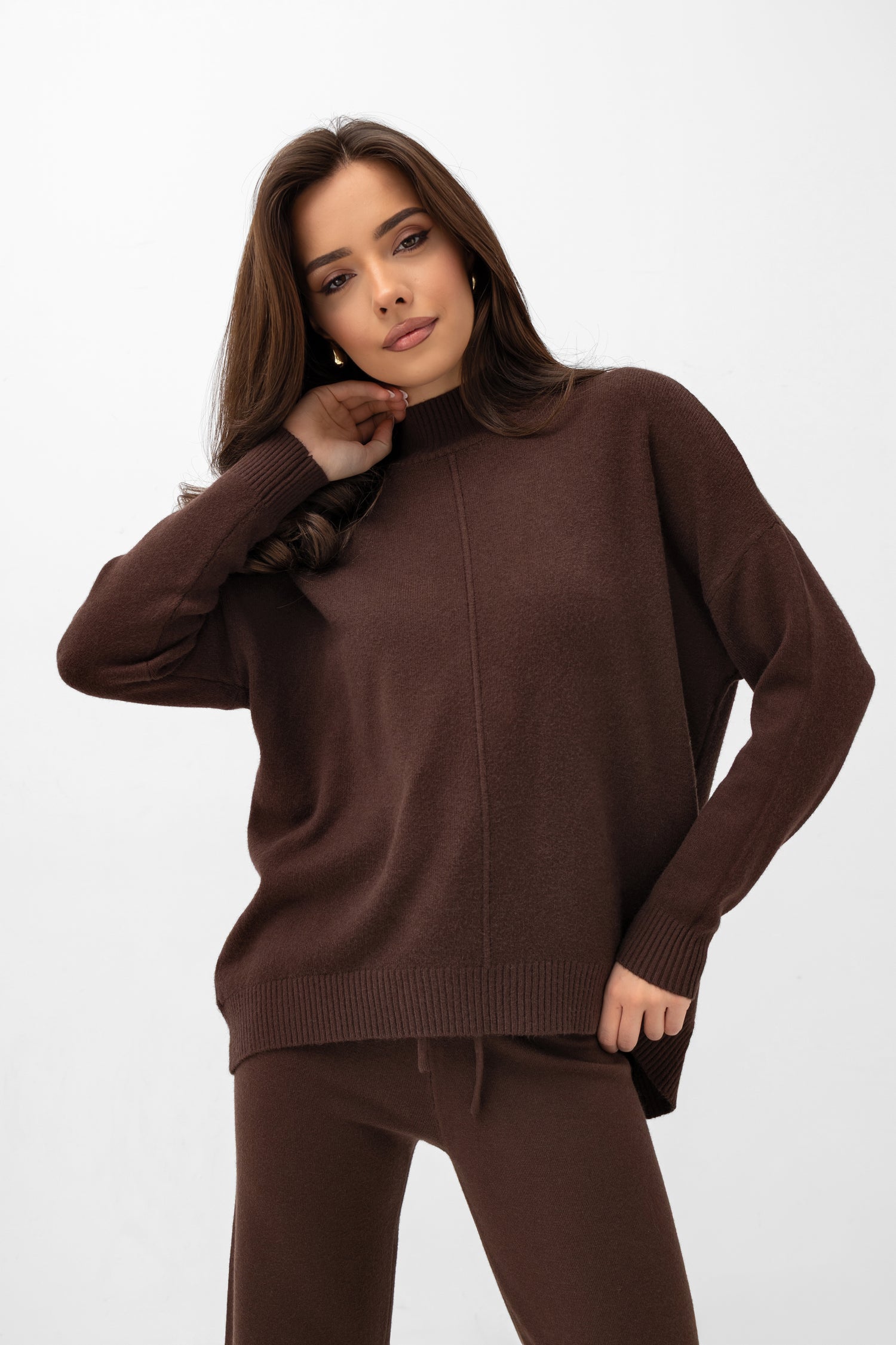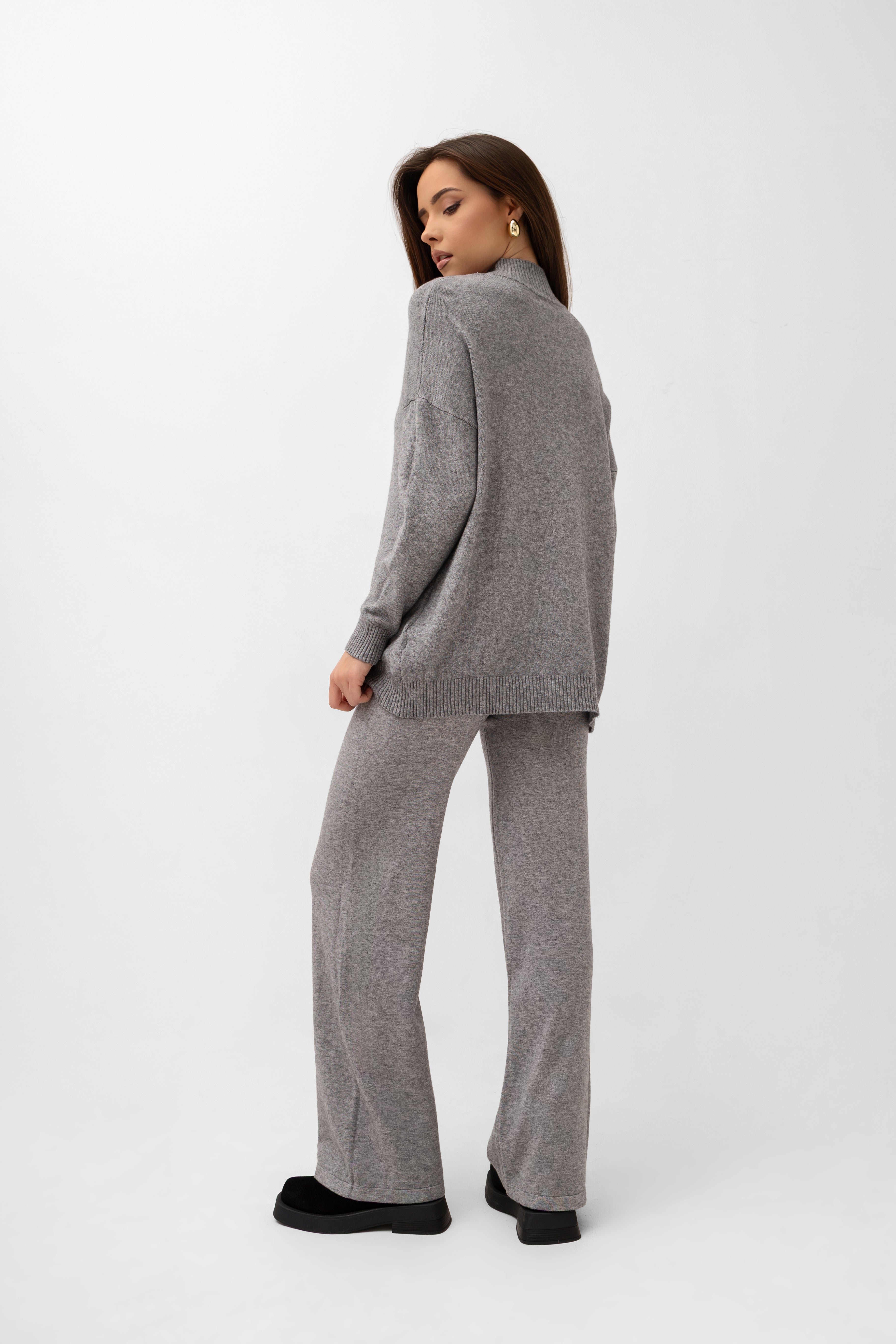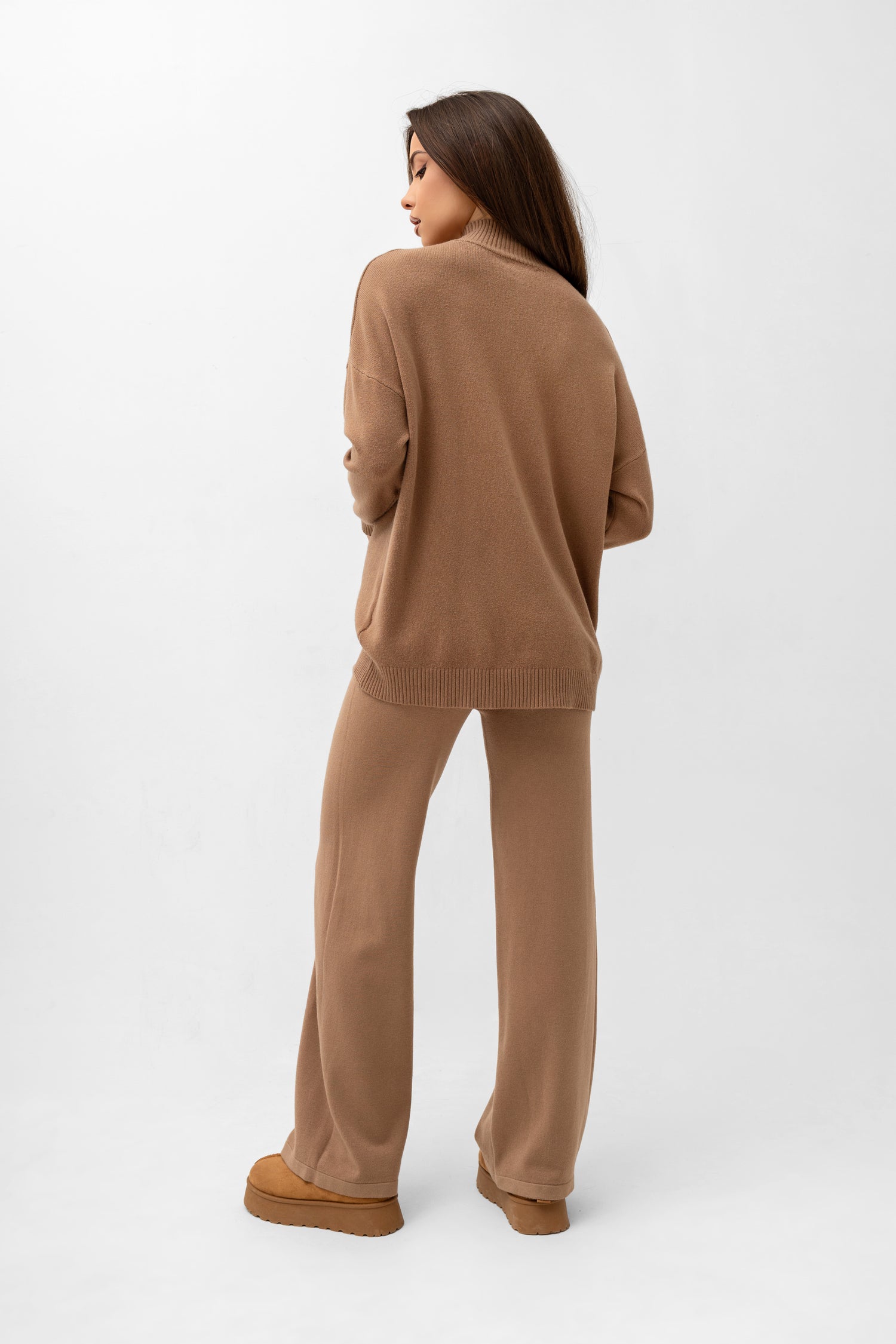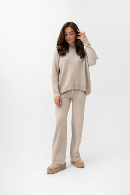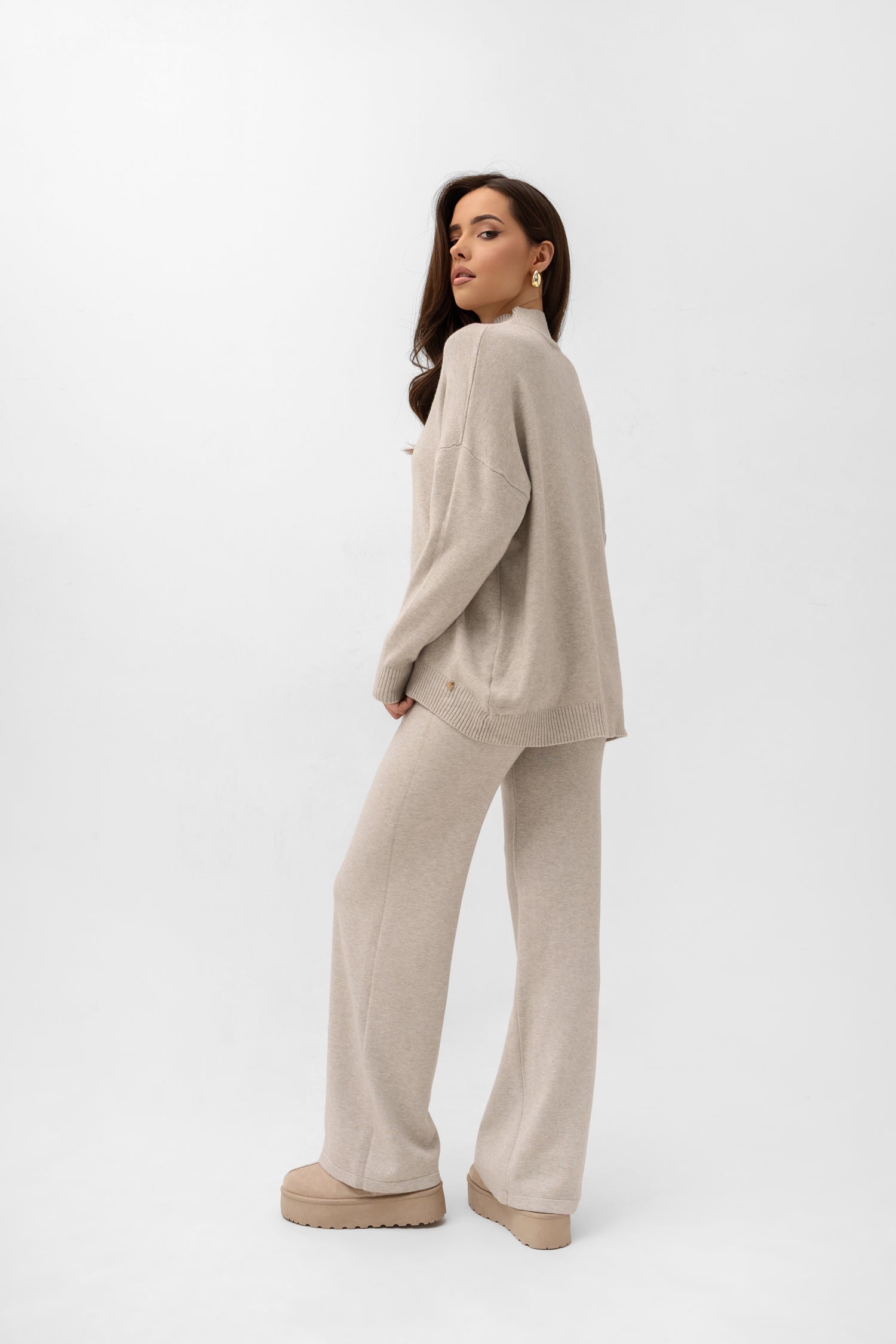 Sweter z półgolfem ma dekoracyjne wrobienie przez środek, co dodaje całości subtelnego charakteru. Tył jest nieco dłuższy niż przód, dzięki czemu sylwetka zyskuje lekkości, a ściągacze przy dole i rękawach podkreślają staranne wykończenie. Spodnie z gumką w pasie o prostym fasonie z prostymi nogawkami idealnie uzupełniają zestaw, tworząc spójną stylizację gotową do noszenia zarówno w domu, jak i w miejskich outfitach.