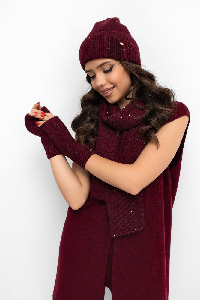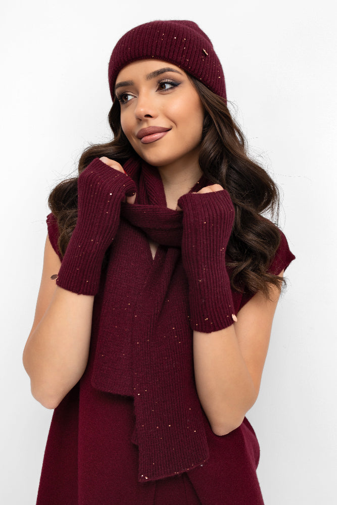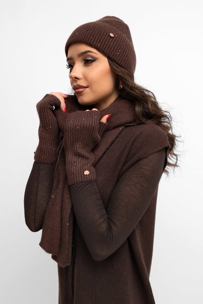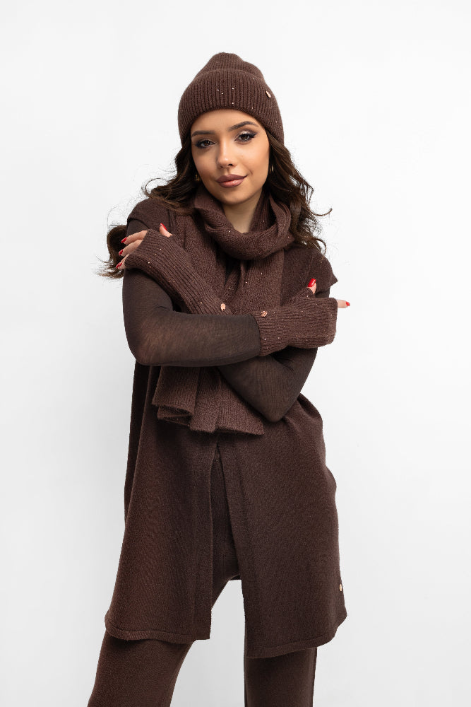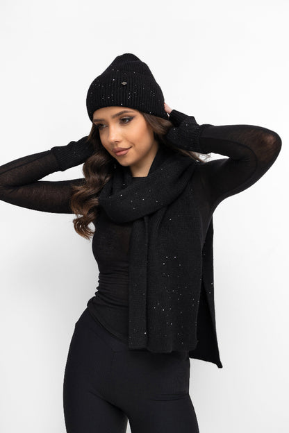 Stylowy komplet zimowy z kolekcji Bastet by Agnieszka Włodarczyk to połączenie klasyki, kobiecego blasku i najwyższej jakości dzianiny. W jego skład wchodzą: czapka z wywinięciem, długi prosty szalik oraz bezpalcowe rękawiczki – wszystkie ozdobione subtelnymi cekinami, które delikatnie połyskują w świetle, dodając całości elegancji.