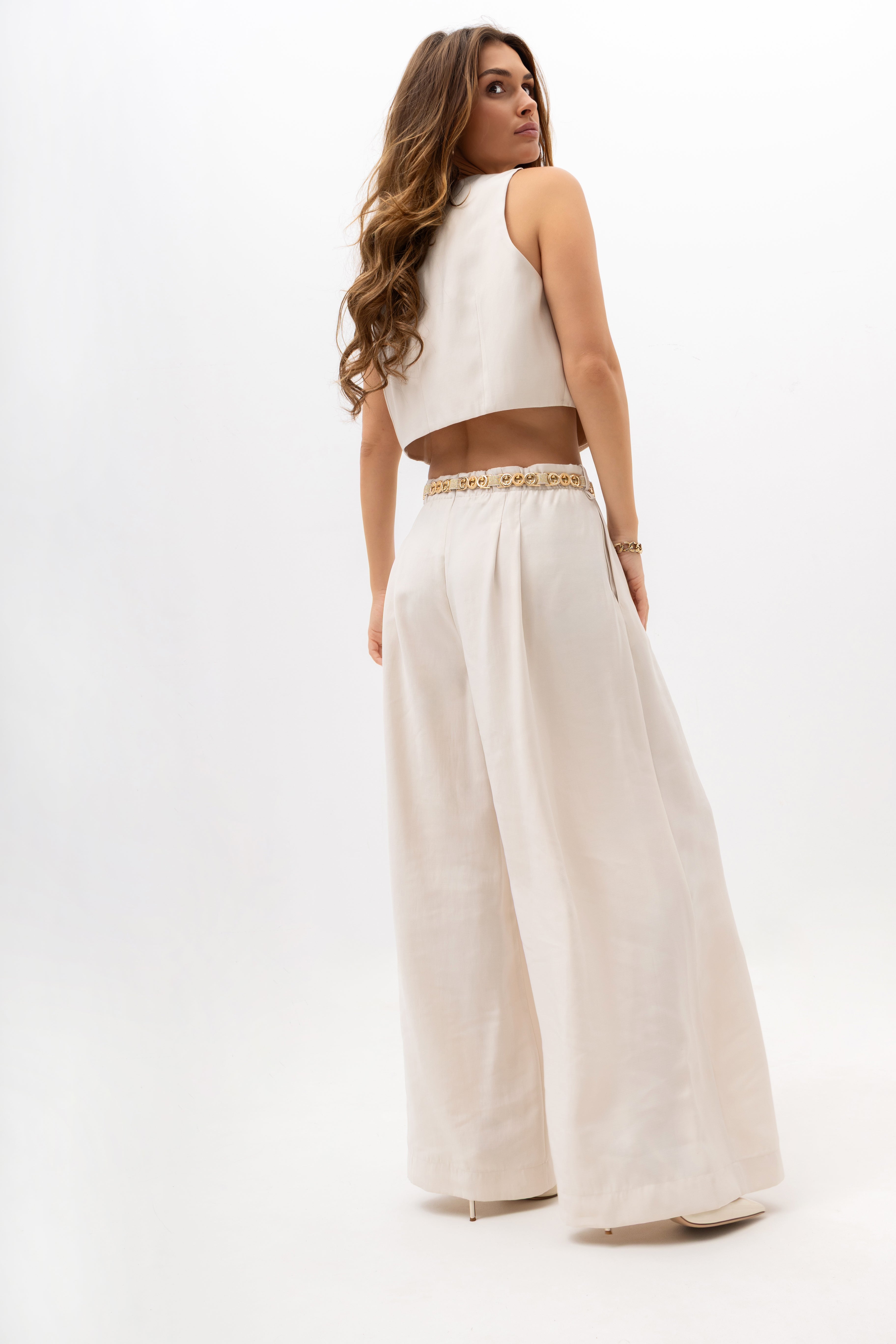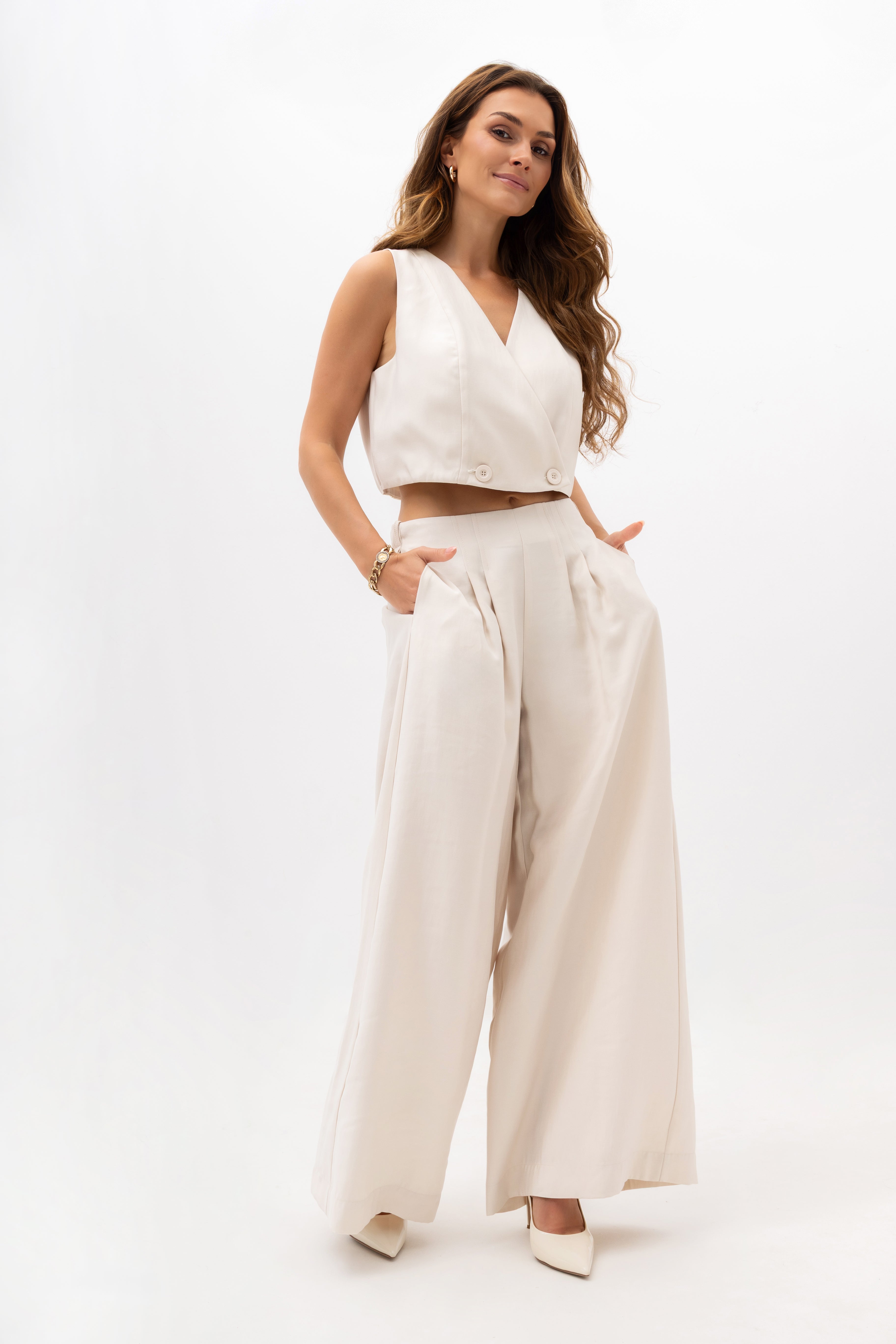 Minimalistyczny krój pozwala na tworzenie wielu ciekawych zestawów – od eleganckich kompletów ze spódnicą czy spodniami, po bardziej casualowe stylizacje z jeansami. Dzięki swojej prostocie i unikalnym detalom, kamizelka staje się uniwersalnym elementem, który z łatwością wpisze się w różne okazje – zarówno formalne, jak i codzienne.