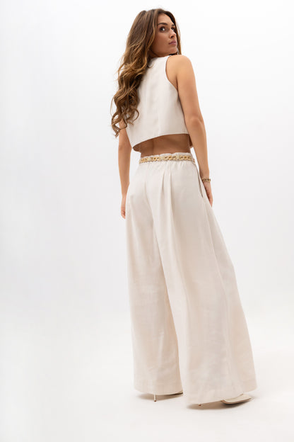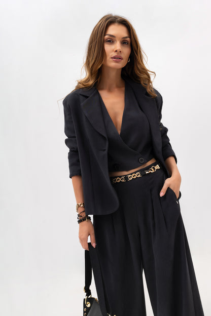 Krótka kamizelka dwurzędowa to nowoczesny element garderoby, który nadaje stylizacji eleganckiego, a zarazem odważnego charakteru. Krótki fason pięknie eksponuje talię, a głęboki dekolt w serek dodaje całości kobiecej lekkości. Dwurzędowe zapięcie na logowane guziki nadaje projektowi wyrafinowanego wykończenia i sprawia, że kamizelka staje się nie tylko praktyczna, ale również stylowym akcentem w każdej stylizacji.
