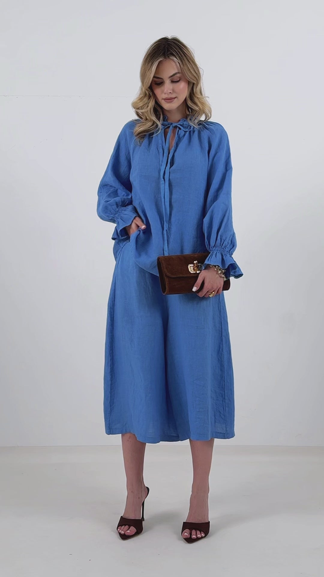 Ta wyjątkowa koszula lniana to połączenie lekkości, subtelnego romantyzmu i wygody. Dekolt w kształcie litery V wykończony delikatną plisą i ozdobną stójką z falbanką podkreśla kobiecą linię szyi. Marszczenie przy dekolcie dodaje formie miękkości, a reglanowy rękaw zakończony gumką tworzy efekt subtelnej falbanki przy nadgarstku.