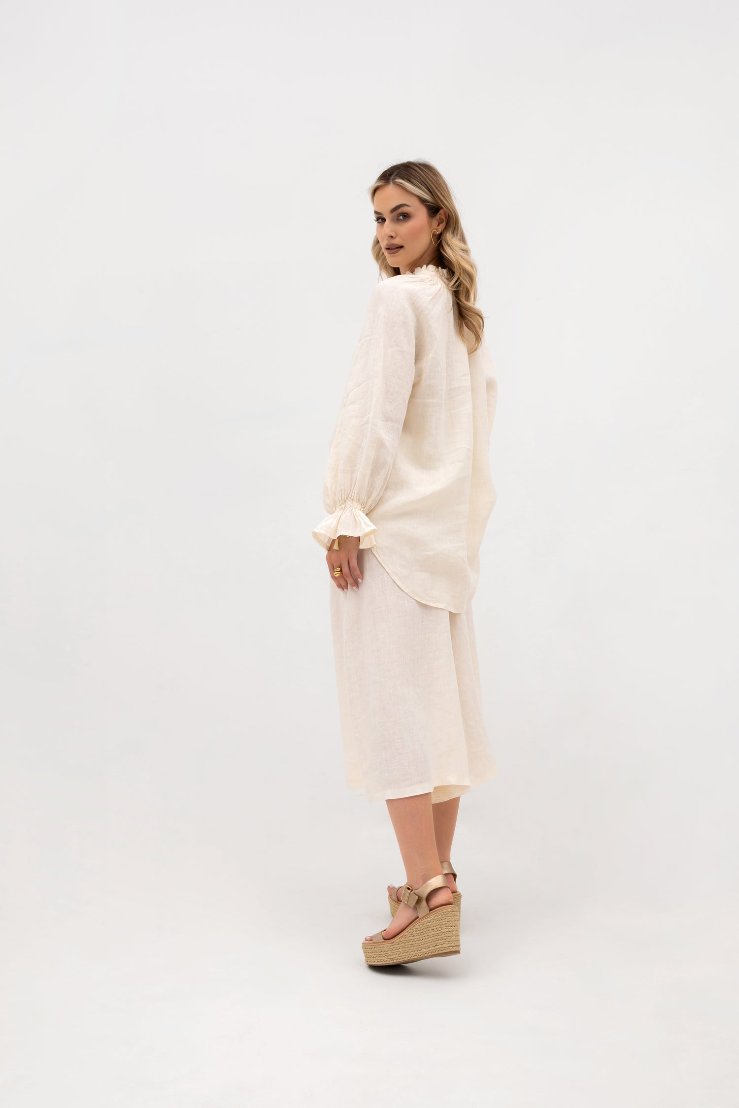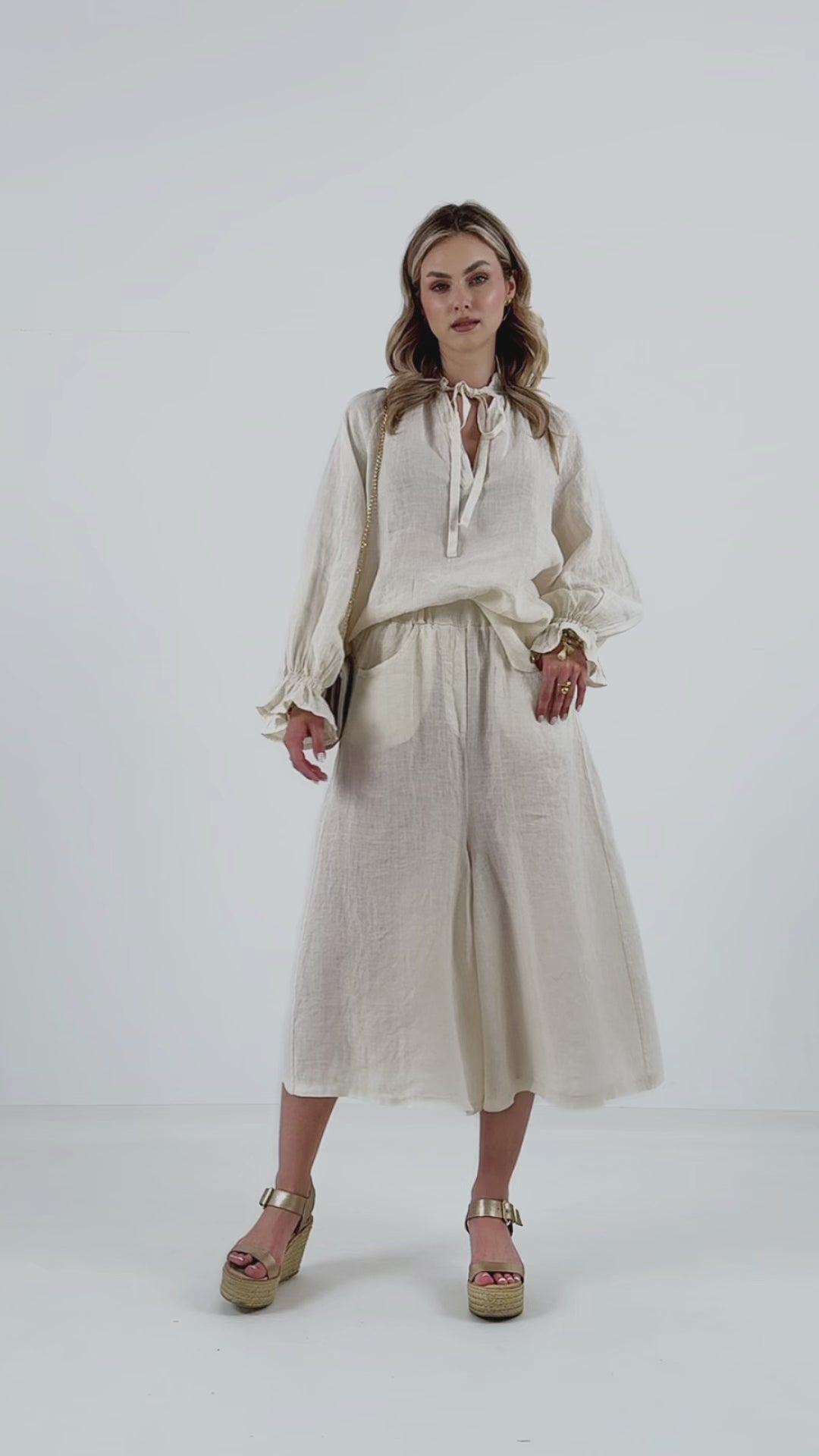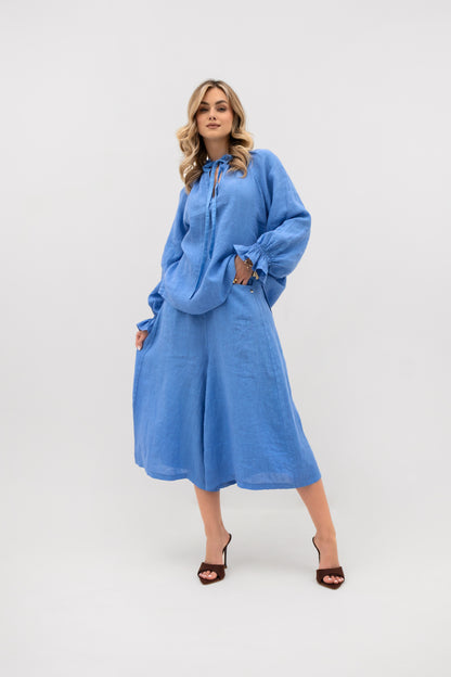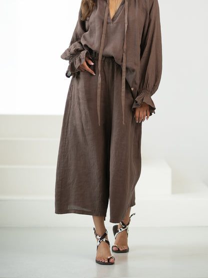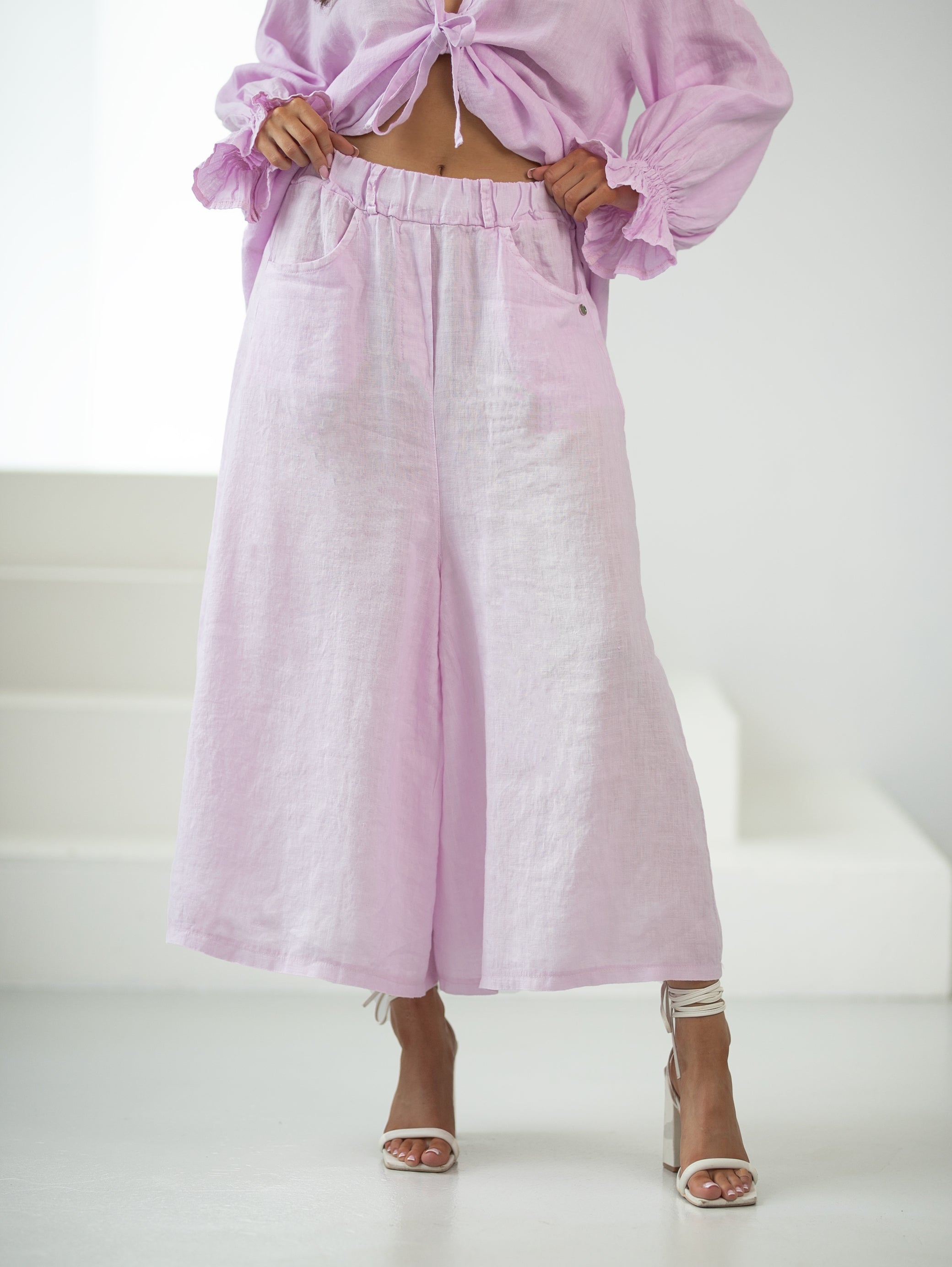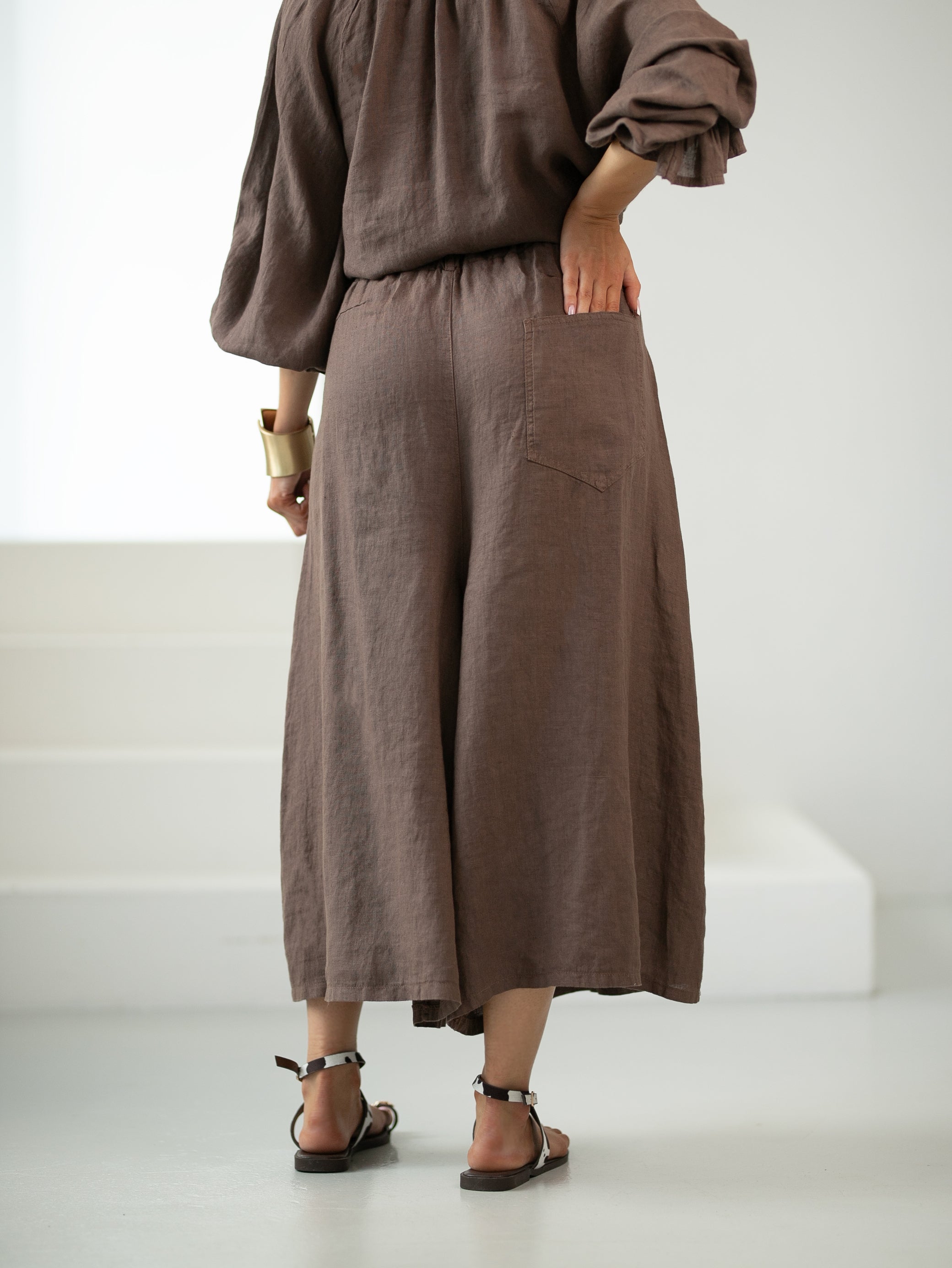 Lniane kuloty 7/8 – szerokie spódnico-spodnie z gumką w pasie