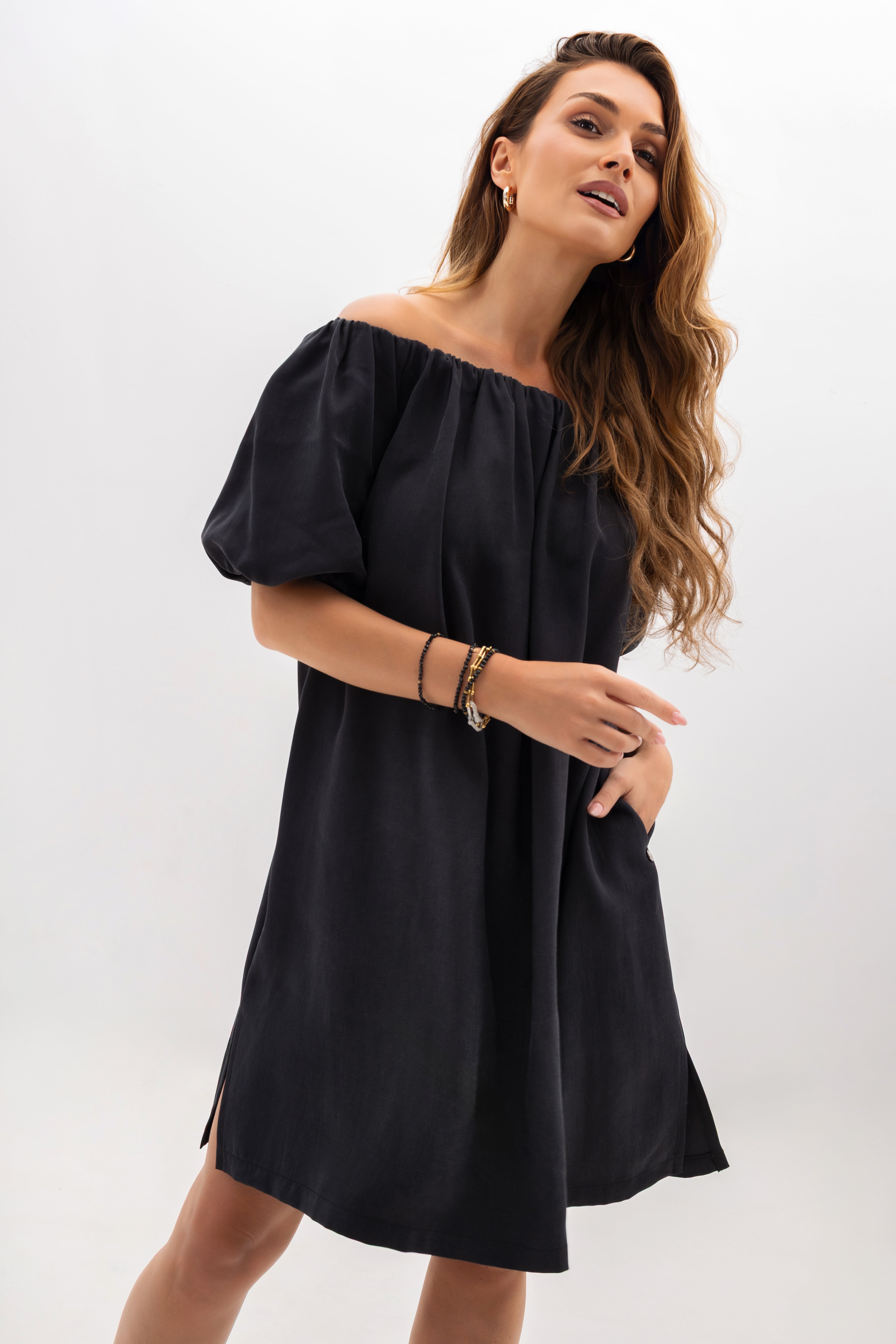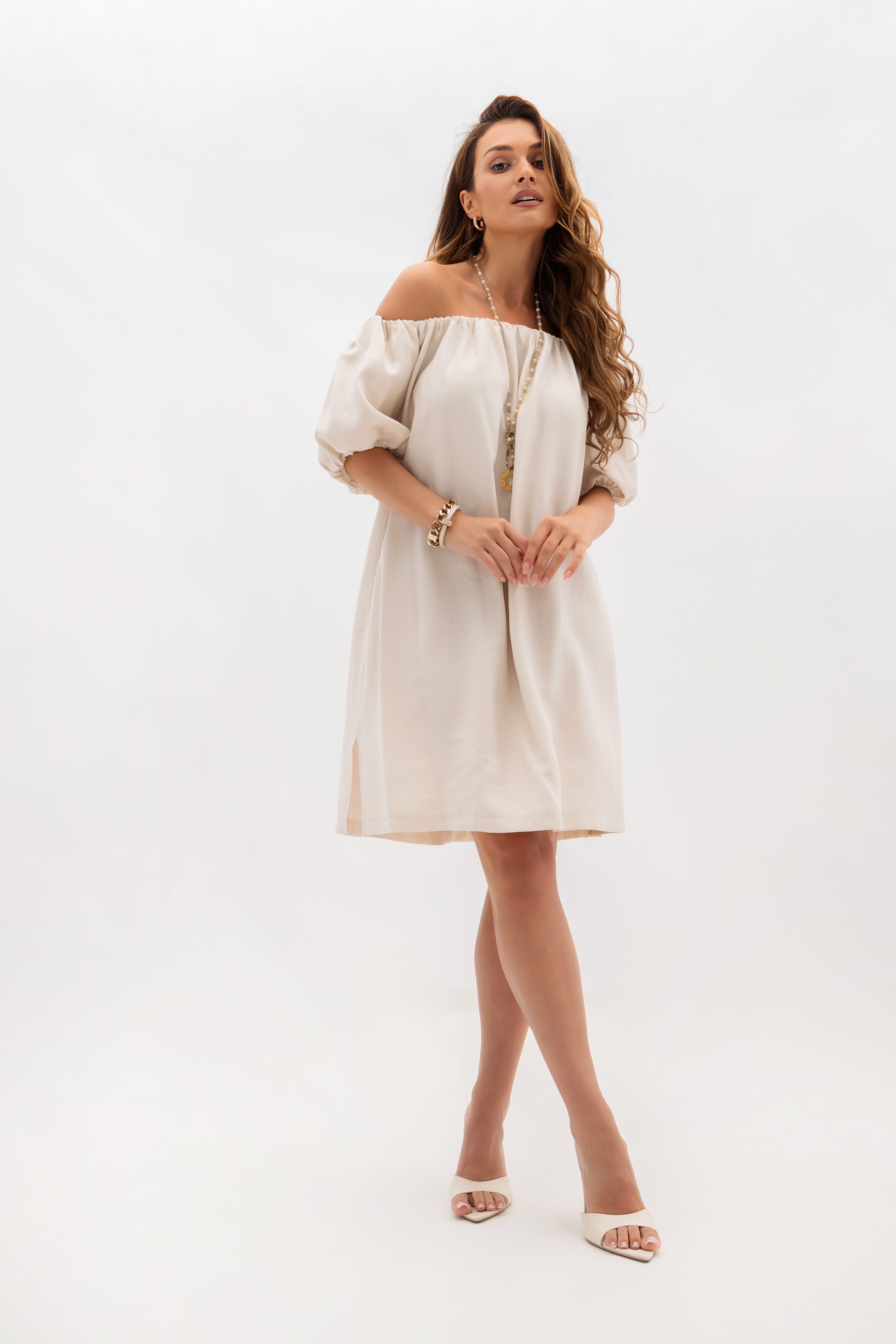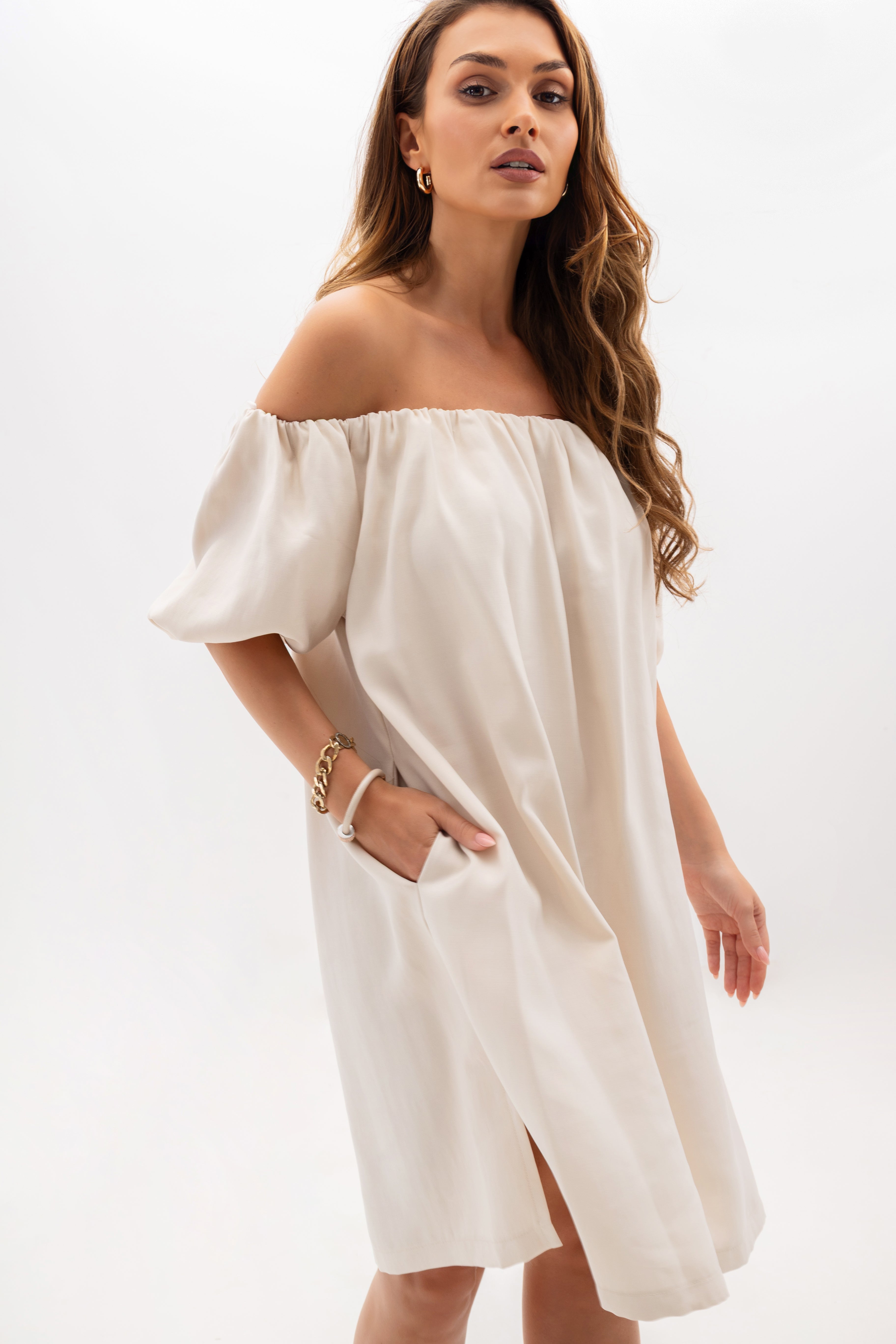 Rękawy zakończone gumką tworzą delikatne bufki, które dodają sylwetce uroku i lekkości. Funkcjonalne kieszenie wszyte w bokach sukienki sprawiają, że jest nie tylko elegancka, ale i praktyczna. Dodatkowym atutem są subtelne rozporki po bokach, które nadają całości zwiewności i podkreślają kobiecą linię nóg.