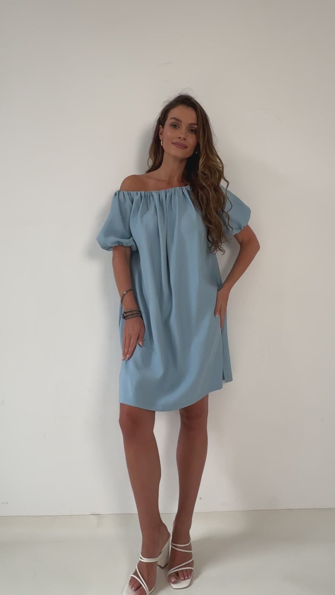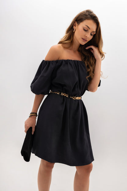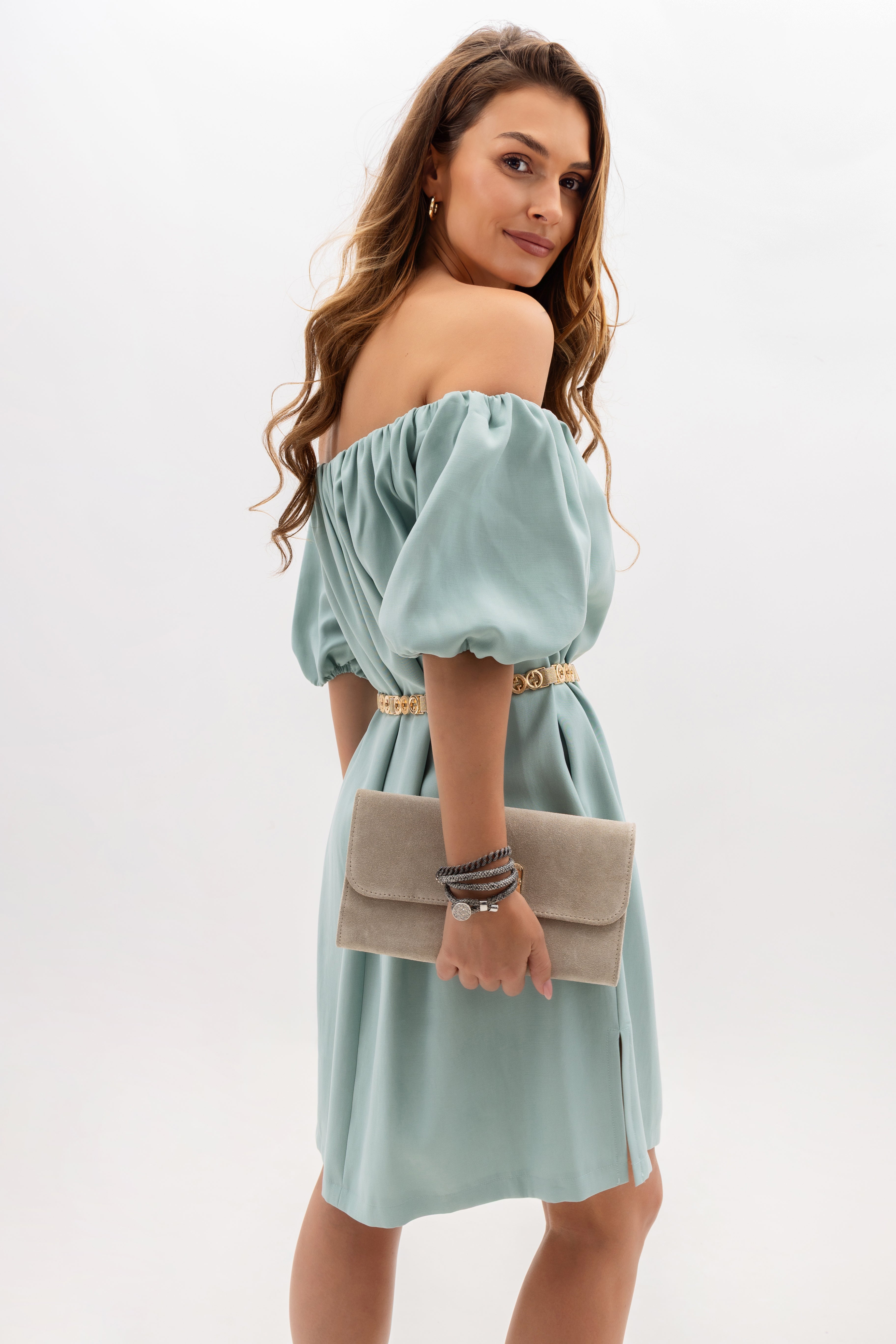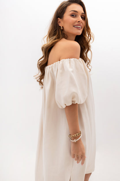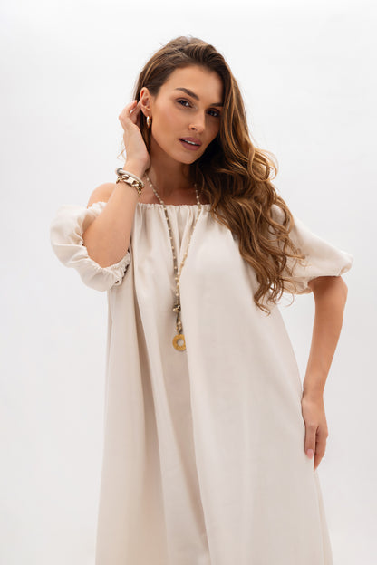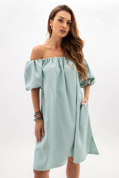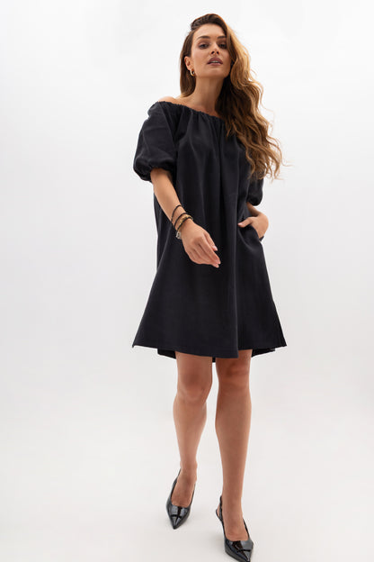 Rękawy zakończone gumką tworzą delikatne bufki, które dodają sylwetce uroku i lekkości. Funkcjonalne kieszenie wszyte w bokach sukienki sprawiają, że jest nie tylko elegancka, ale i praktyczna. Dodatkowym atutem są subtelne rozporki po bokach, które nadają całości zwiewności i podkreślają kobiecą linię nóg.