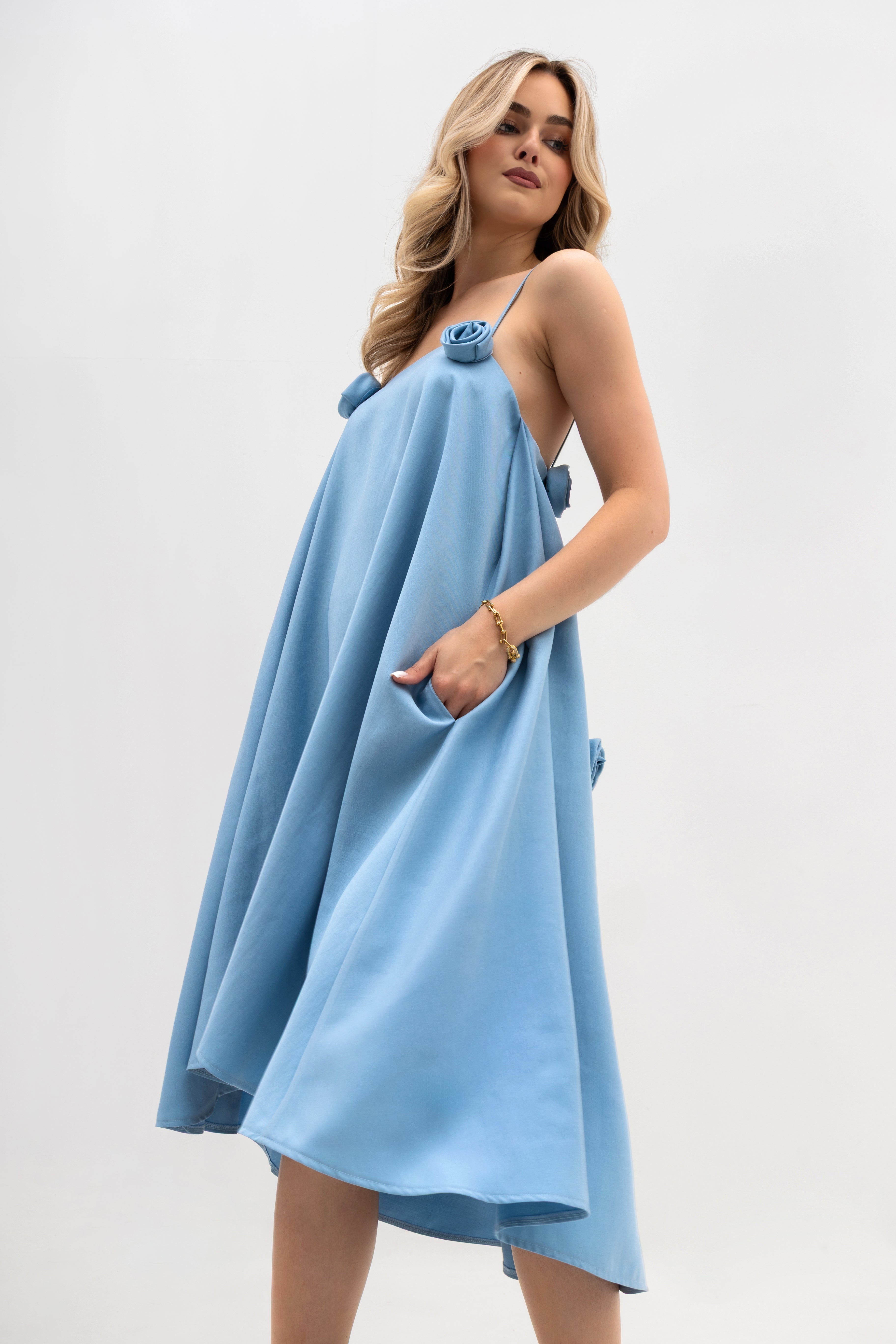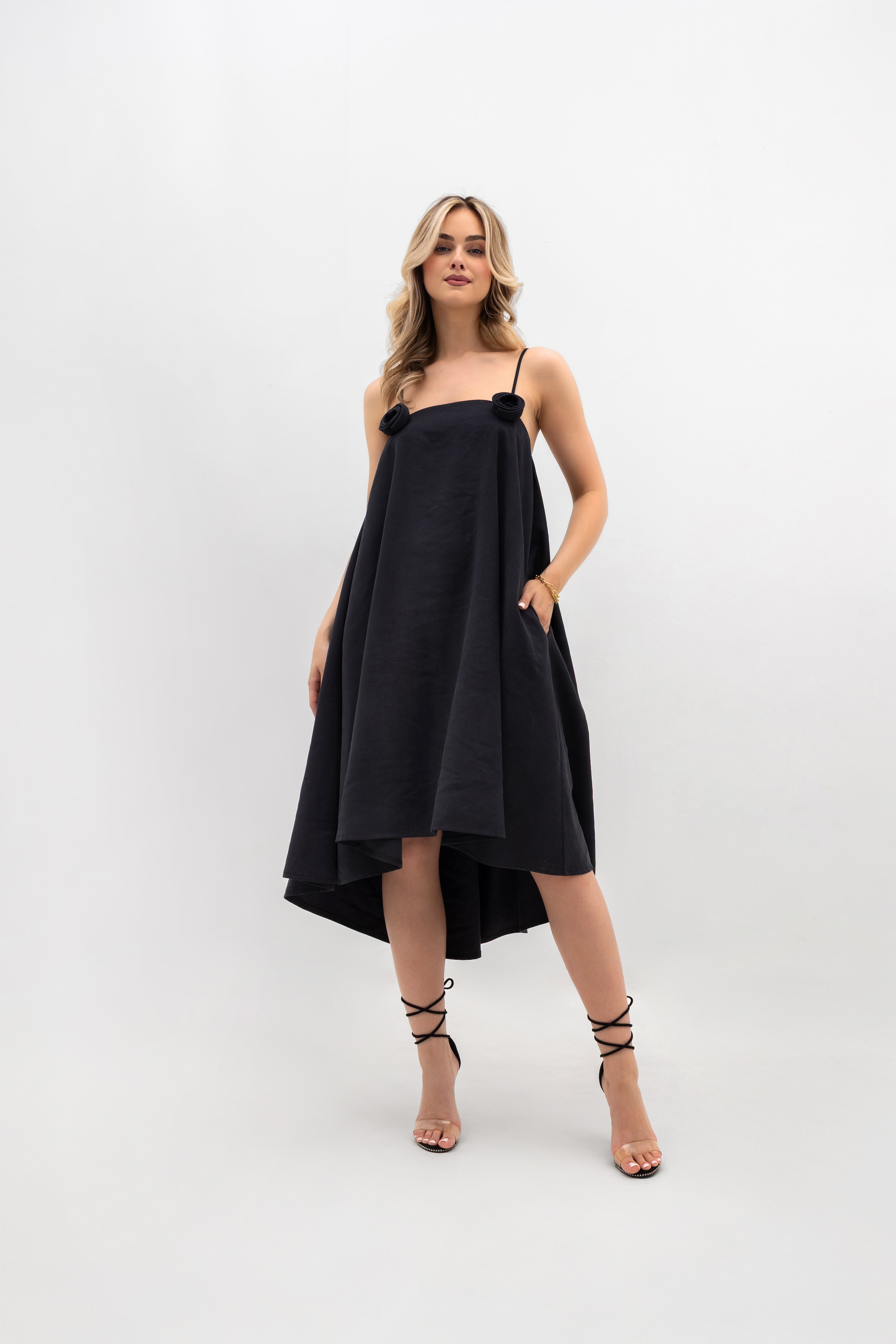 Sukienka na ramiączkach z różami – rozkloszowana z kontrafałdą i kieszeniami