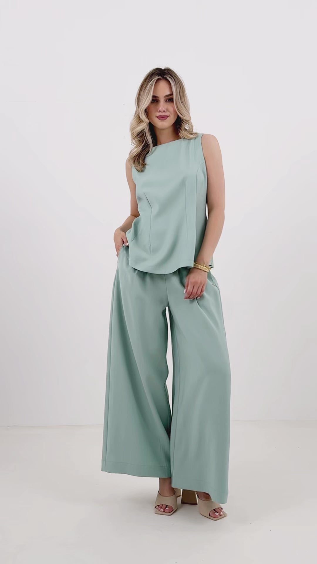 Klasyczny top bez rękawów w nowoczesnym wydaniu. Model o dopasowanym kroju został wyprofilowany pionowymi cięciami, które pięknie podkreślają kobiecą sylwetkę, zachowując jednocześnie minimalistyczną formę. Półokrągły dekolt subtelnie eksponuje szyję, a delikatne pęknięcie na plecach zapinane na guzik dodaje całości lekkości i wyrafinowania.